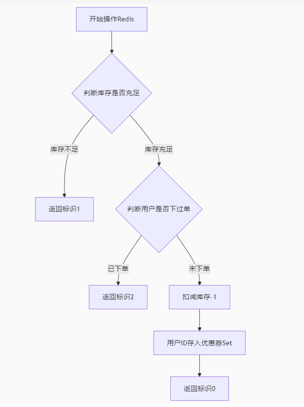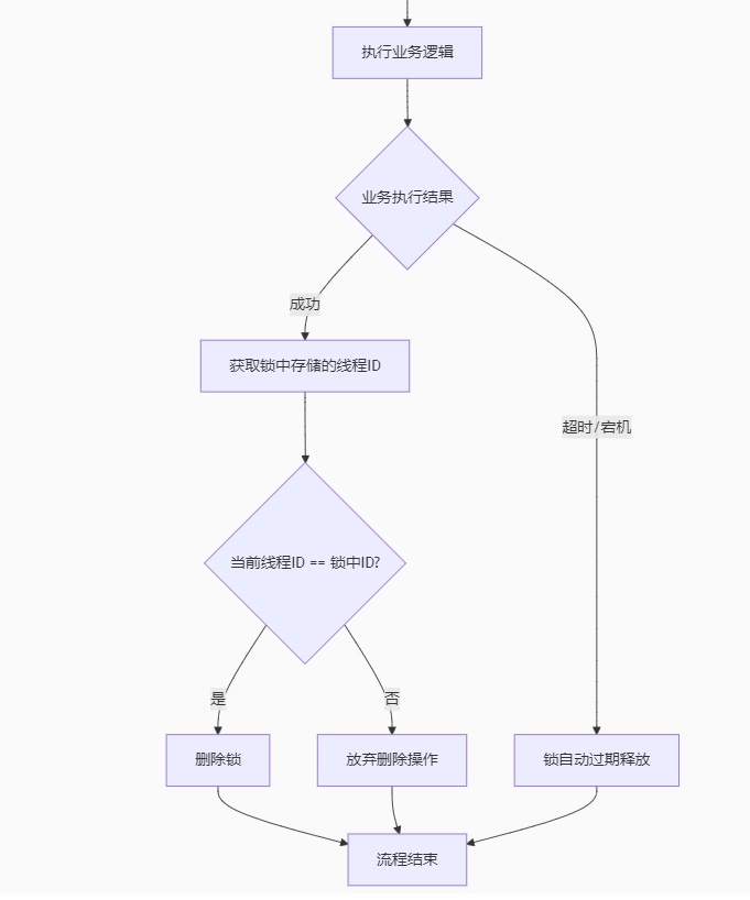 开始(跳过一些业务) ==》尝试获取锁 ==》判断获取锁是否成功 ==》获取锁失败 ==》返回错误信息,不再重试(由于实现的是一人一单,获取锁失败则已经下过单了) ------- ==》获取锁成功,设置过期时间(原子性操作) ==》执行业务 ==》业务超时/服务宕机 ==》锁自动释放(删除key) ------- ==》业务执行成功 ==》取出锁中存储的value(获取锁的线程id) ==》获取id与执行删除锁线程id进行判断 ==》id一致 ==》释放锁(删除key) ---- ==》不一致,不执行删除操作