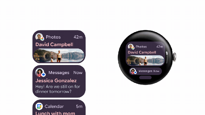 对于 Wear OS 手表设备而言,Material 3 Expressive 的设计更加流畅,带有沿着圆形显示屏滚动的动画。就像在手机上一样,新的设计语言将带来一种深度感。