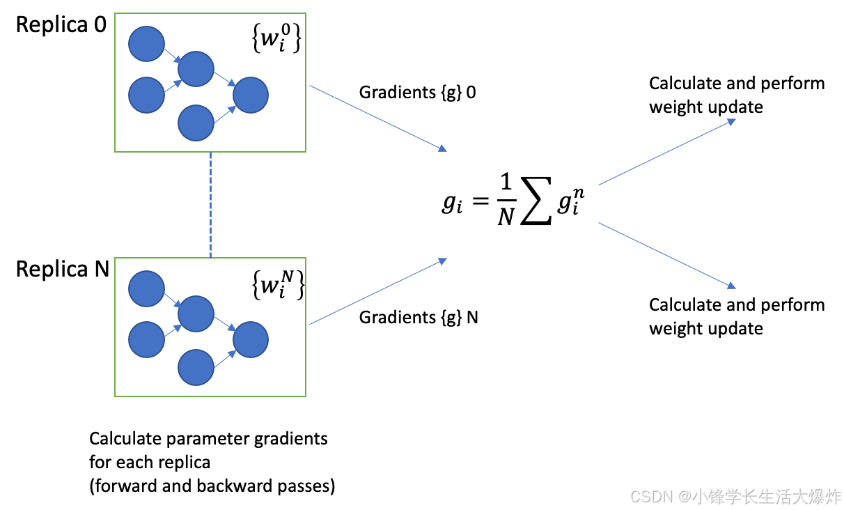 在模型足够小,但数据集很大的情况下,可以应用数据并行的概念。这意味着相同的模型被加载到每个GPU上,但数据在GPU之间被拆分。数据并行是执行分布式训练的最常见方法。副本通常跨越多个GPU,甚至系统。跨副本引入了更多通信,并引入了性能开销。通信开销的相对影响可以通过使用更大的副本批量来减少,通常是通过增加梯度积累。