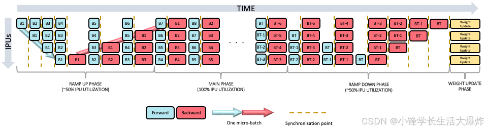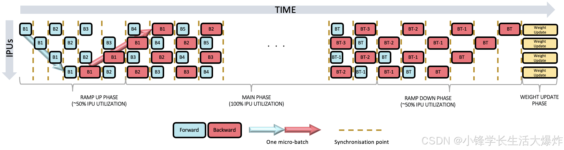 通过运行数据流水线来最大化GPU/CPU的利用率、重叠计算和通信阶段。一旦建立了流水线,总是有不止一个微批次“在运行”。