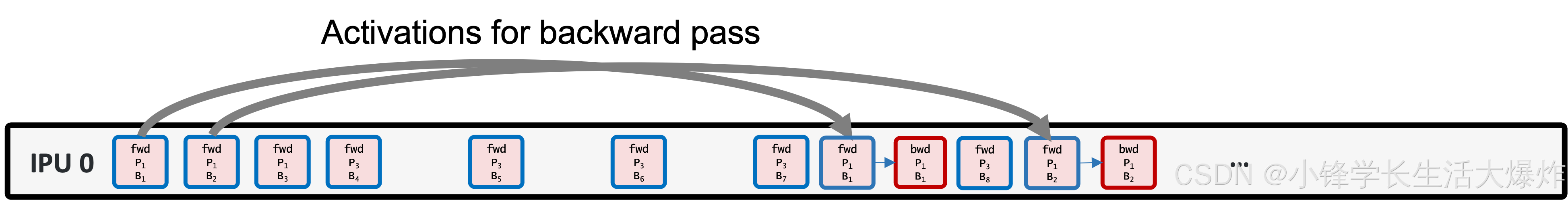 交错调度使用更少的内存来存储激活,但可能会更慢,因为向后传递通常比向前传递长,总是在管道的每个阶段执行: