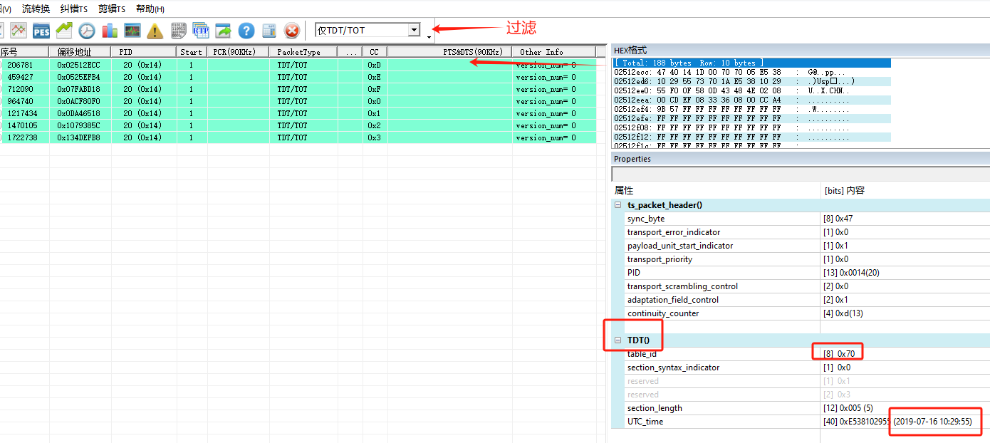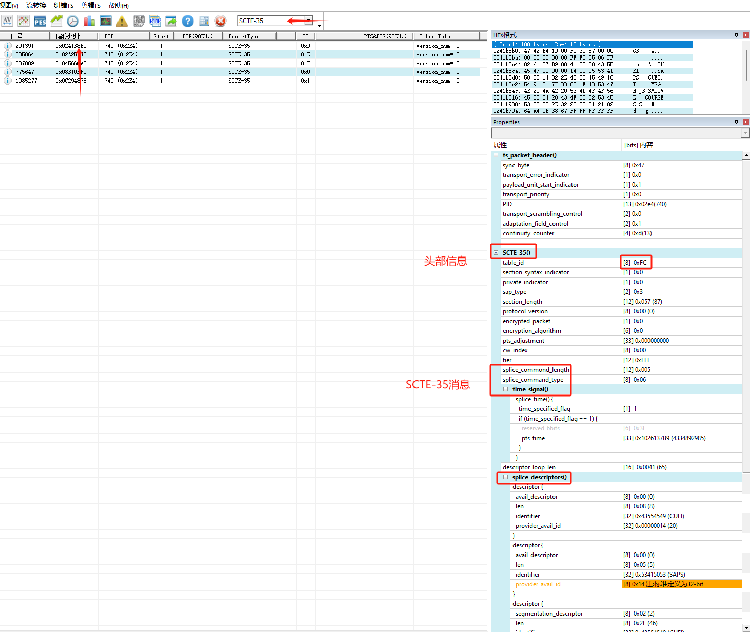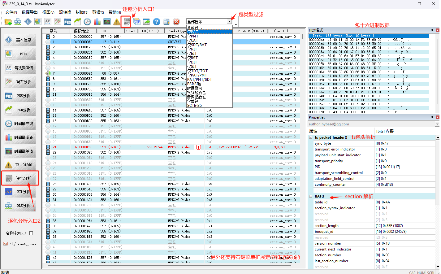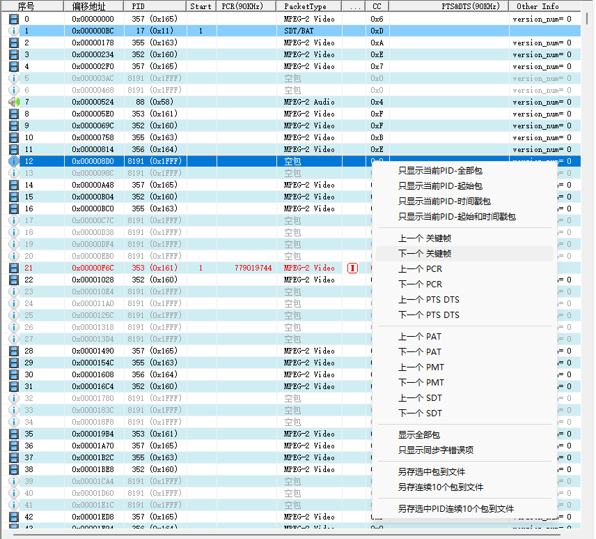 1.TS包列表:序号,偏移地址,PID,起始标识,包类型,时间戳(PCR,PTS,DTS),图像类型(标识I、B、P)等