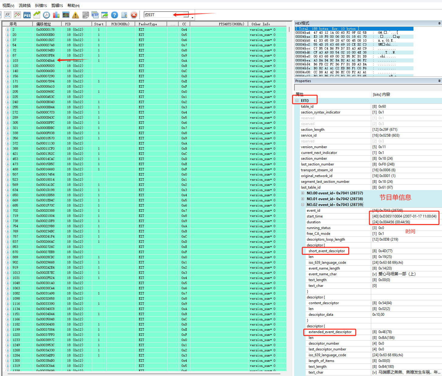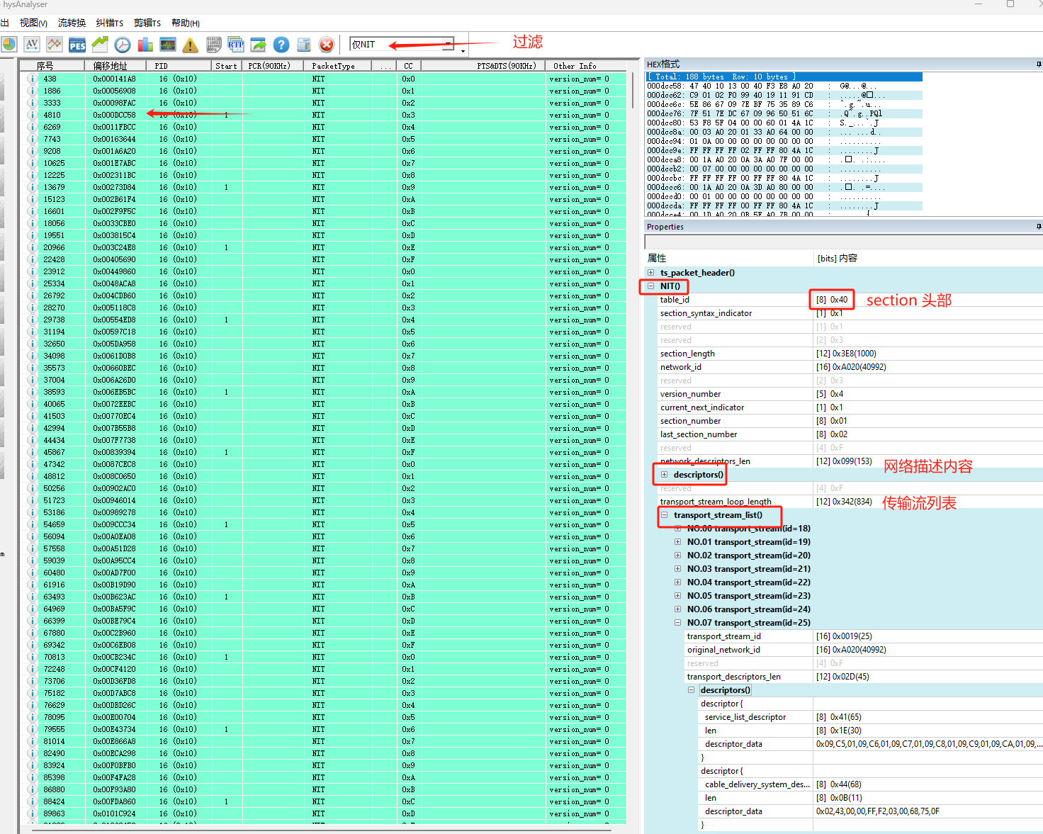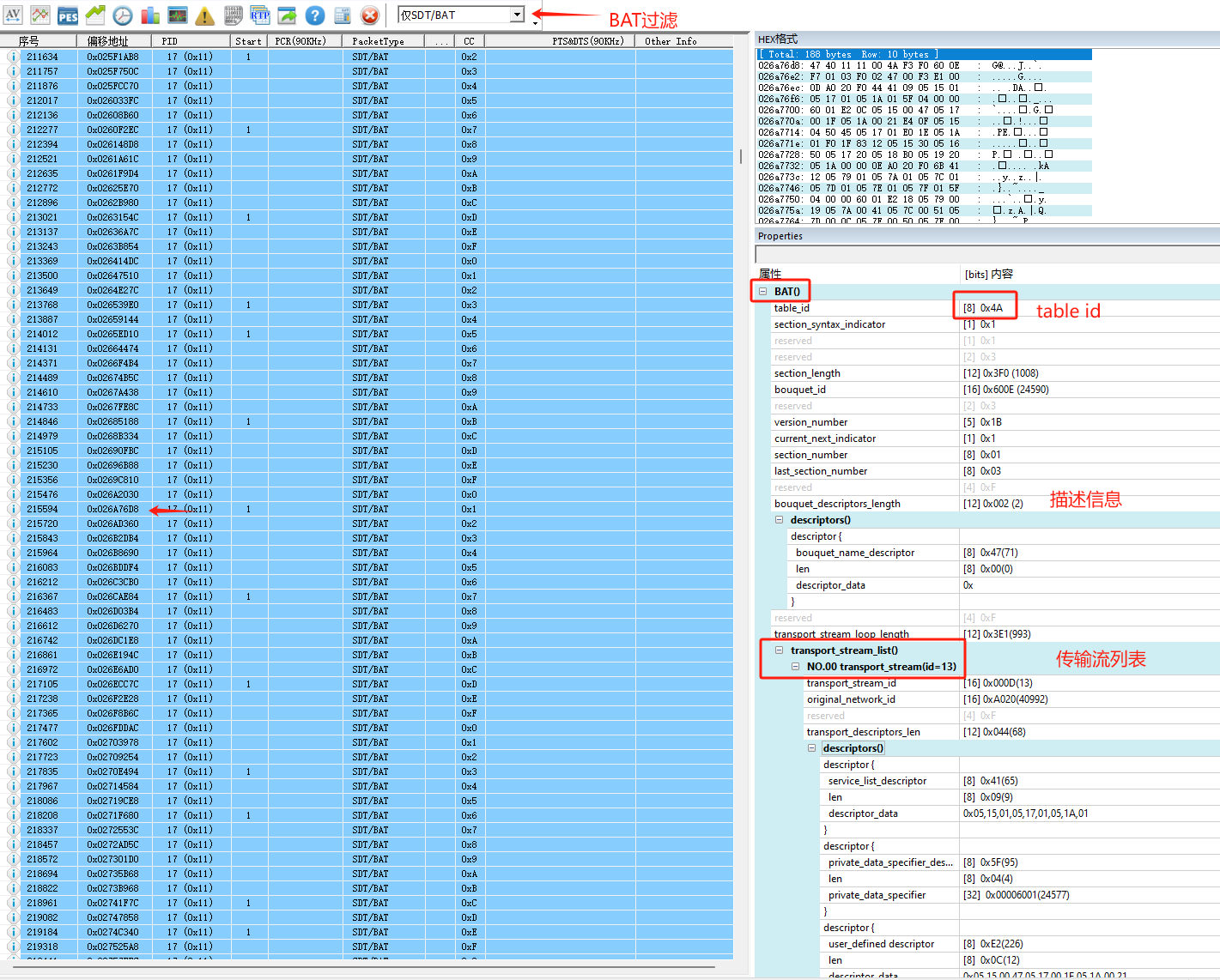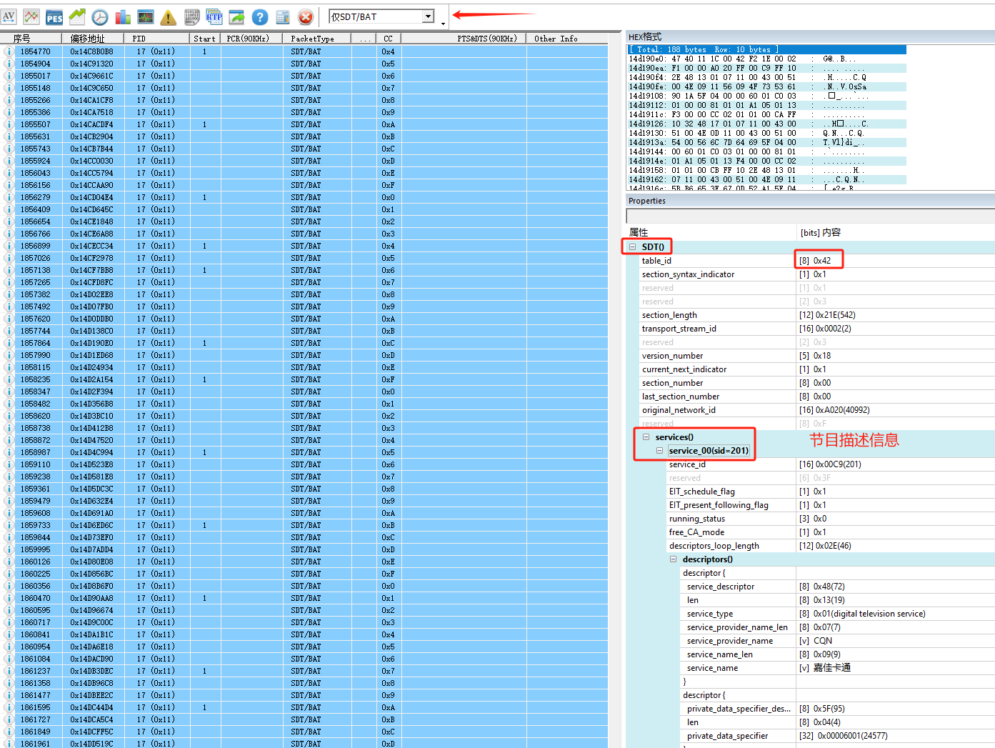 7.解析结果3:PAT/PMT/SDT/BAT/NIT/EIT/RST/TDT/TOT/DIT/SIT等常用数据表的解析及呈现