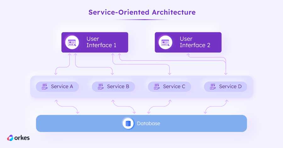 面向服务的架构图示(SOA),应用逻辑被分成独立的服务,尽管这些服务共享一个数据库: