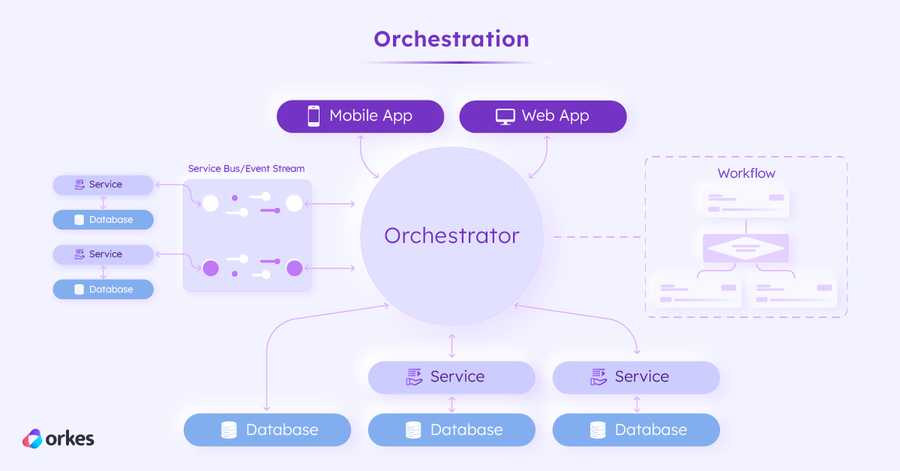 编排图示,各服务、数据库、事件流等连接至中央编排器,协调各组件进入有向的工作流: