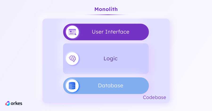 单体架构图示,用户界面、应用逻辑和数据库存储在单一代码库中,一起部署: