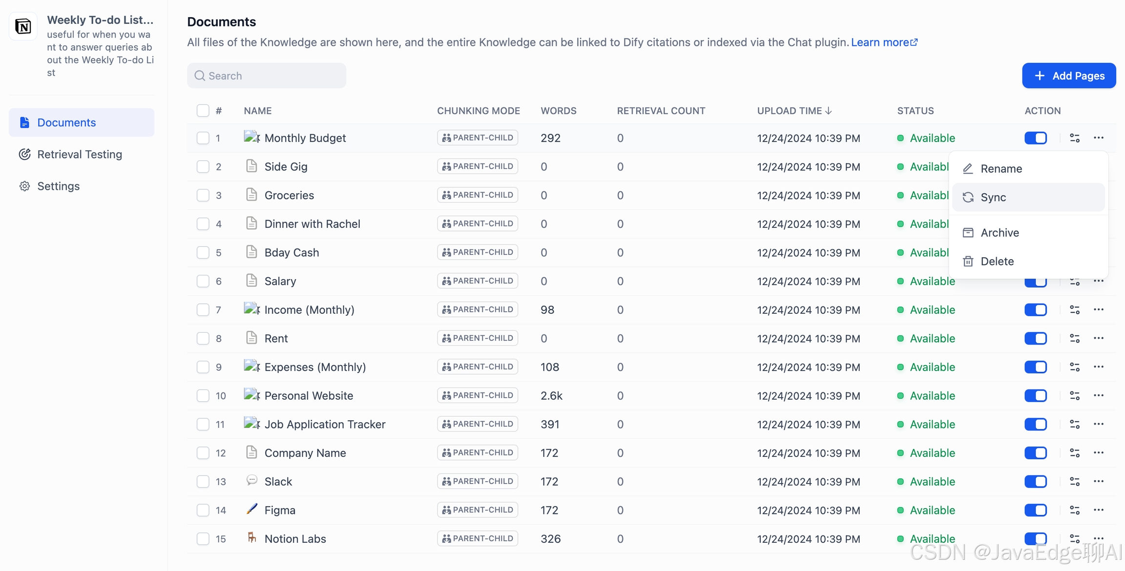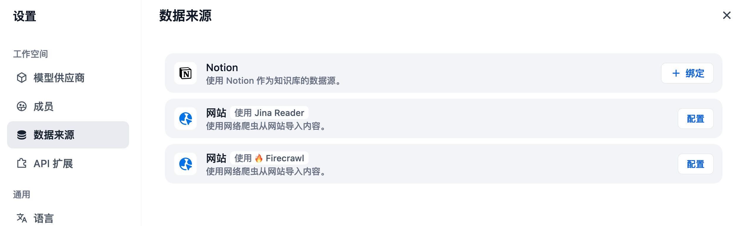Dify知识库支持从 Notion 导入,并支持后续的数据自动同步。点击“去绑定”:
