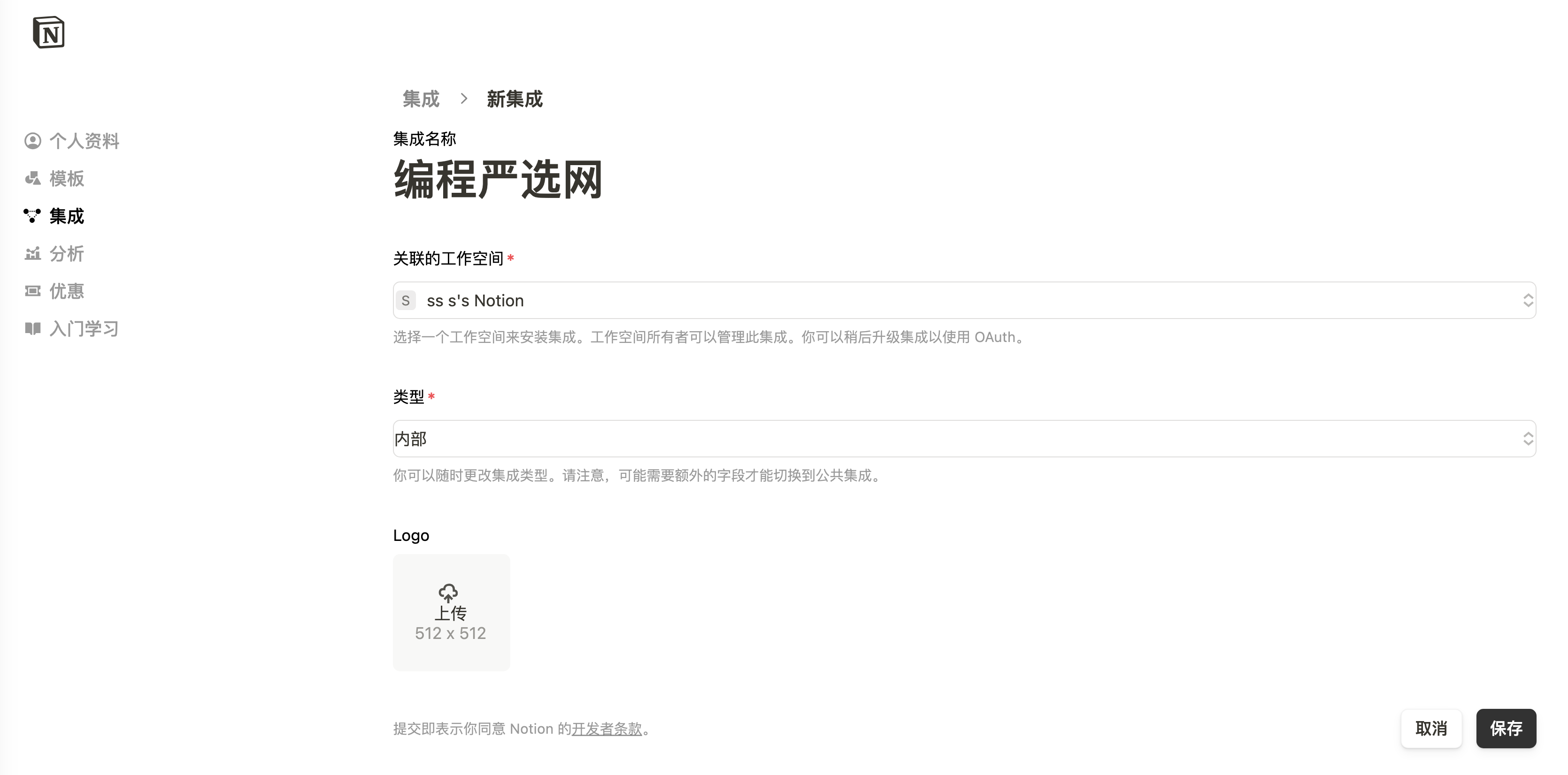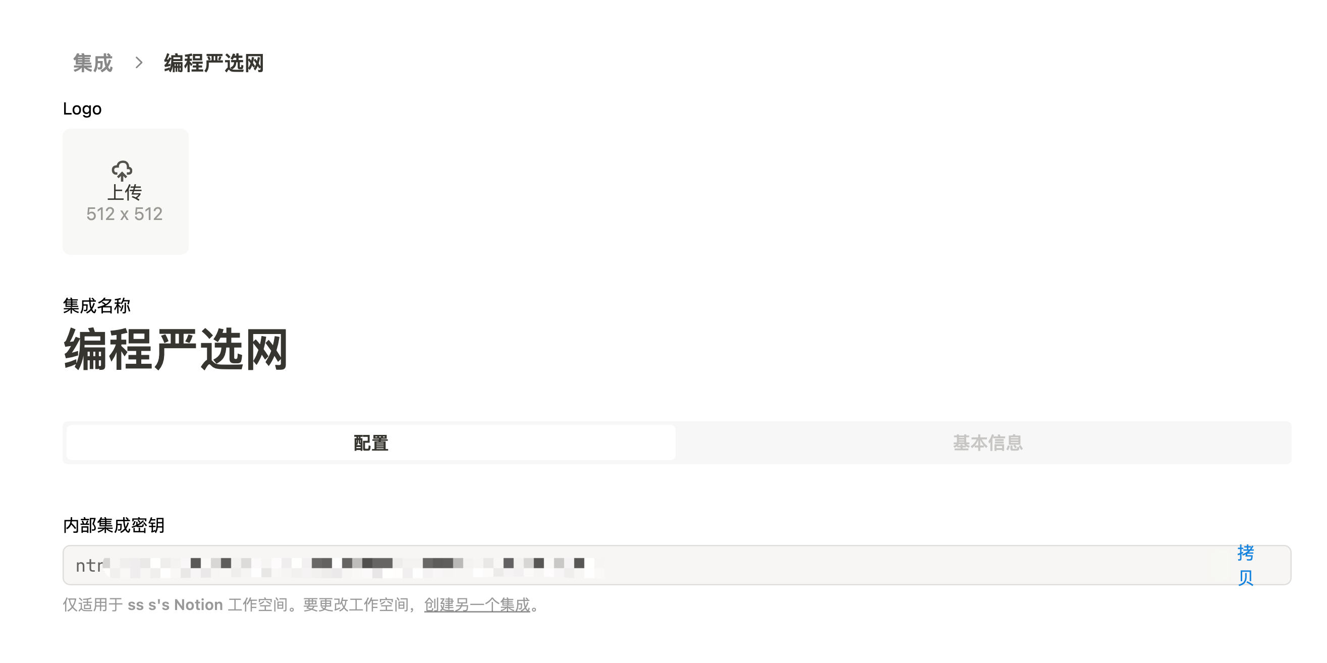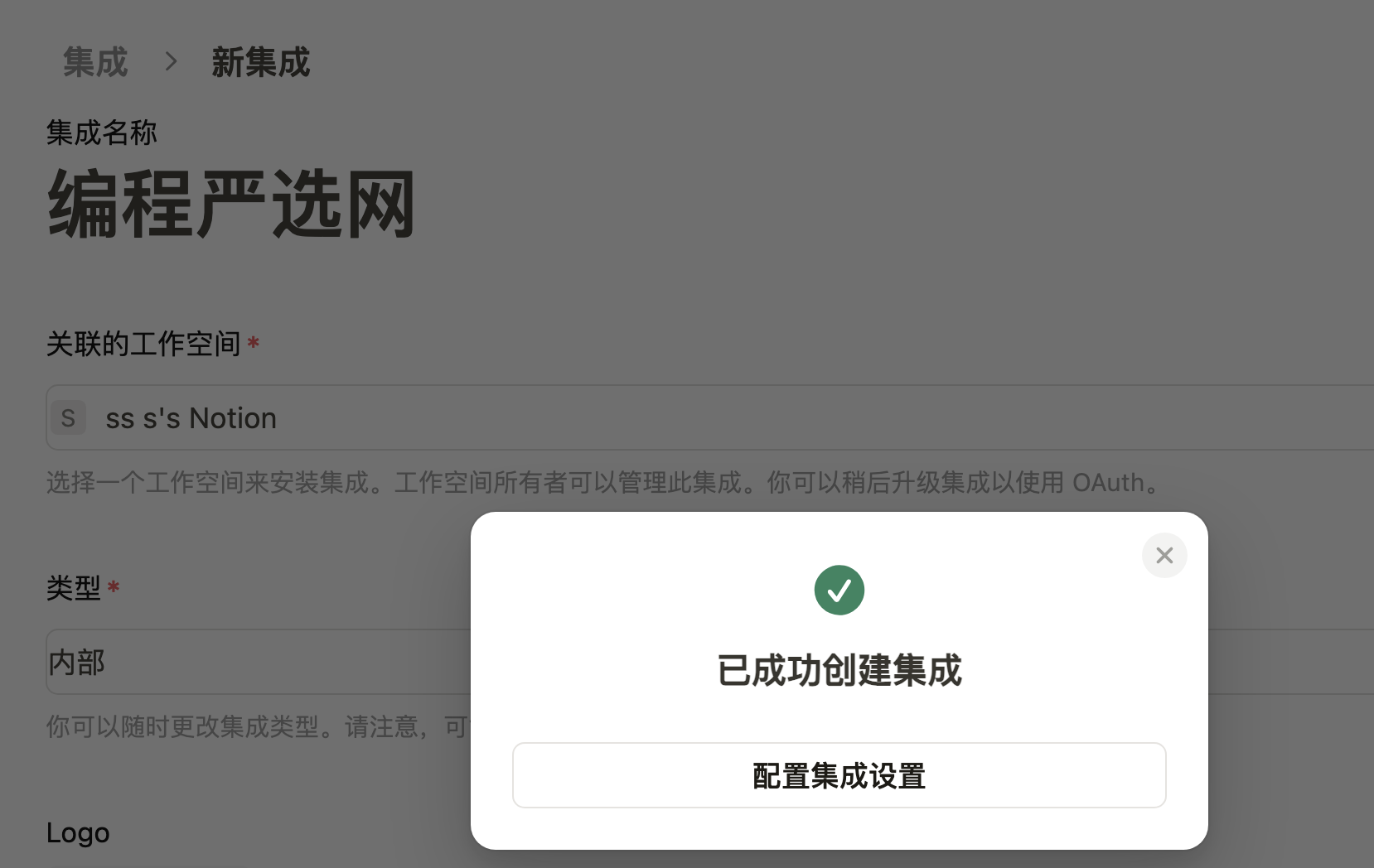 类型默认内部Internal,选择关联的空间,输入集成名称并上传 logo 后,点击“保存”,集成创建成功: