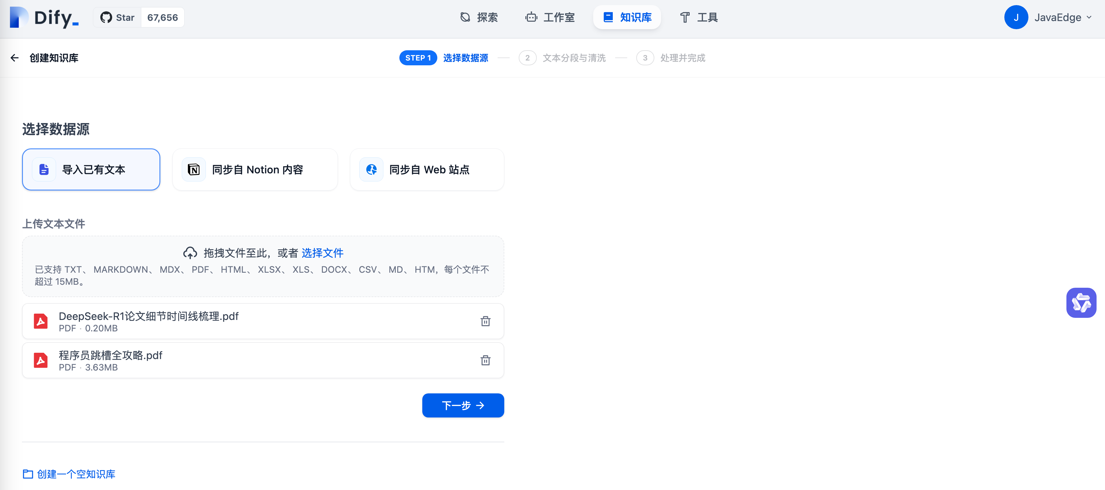创建知识库并上传文档大致分为以下步骤: