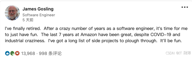 刚过完69岁生日两个月后,Java之父詹姆斯·高斯林(James Gosling)在领英上宣布了自己退休的消息。他表示,“我终于退休了。在做了这么多年软件工程师之后,是时候让我好好玩玩了。尽管受到了COVID-19和工业环境的影响,但在亚马逊的过去7年还是非常美好的。”