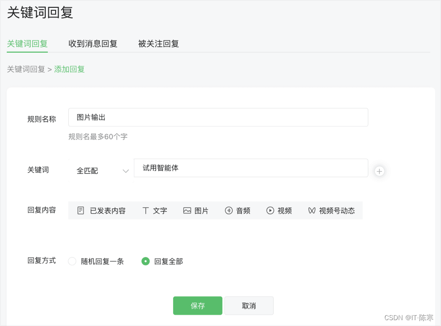 在关键词回复里添加回复,依次输入规则名称、选择关键字、回复内容选择图片。
