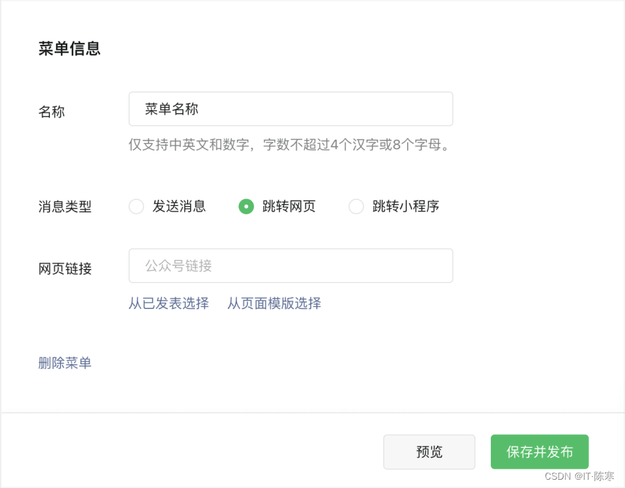 - 配置菜单名称以及消息类型,选择跳转网页。