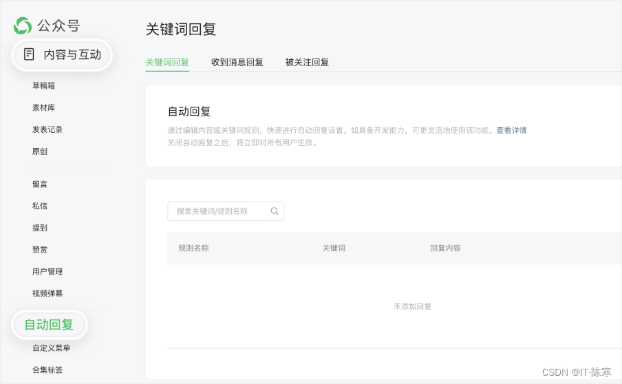 - 关键词自动回复:当粉丝发送的消息内容里面包含了你设置的关键字时,自动回复相关的内容给粉丝。