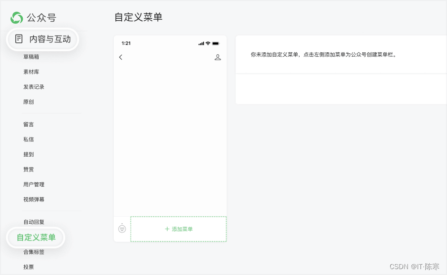 注意:必须是服务号或者已认证订阅号才能配置菜单