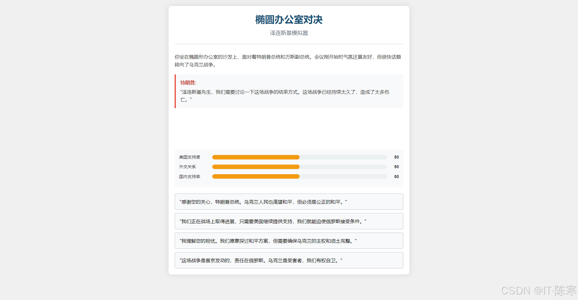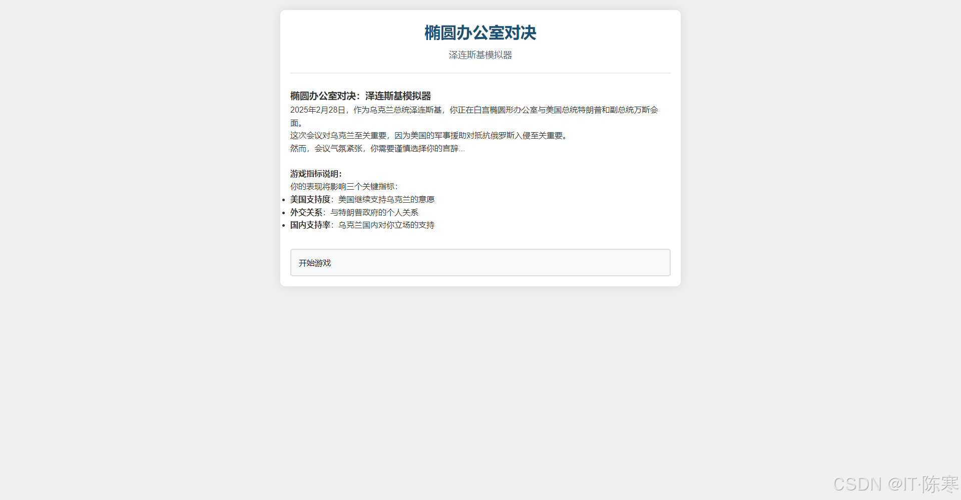 跨界体验往往能带来意想不到的乐趣与启示。该互动游戏以乌克兰总统泽连斯基与美国白宫为背景,模拟政治谈判与国际博弈,让用户在紧张刺激的游戏过程中体验到政治决策的复杂性和多维度冲突。 立即体验 »
