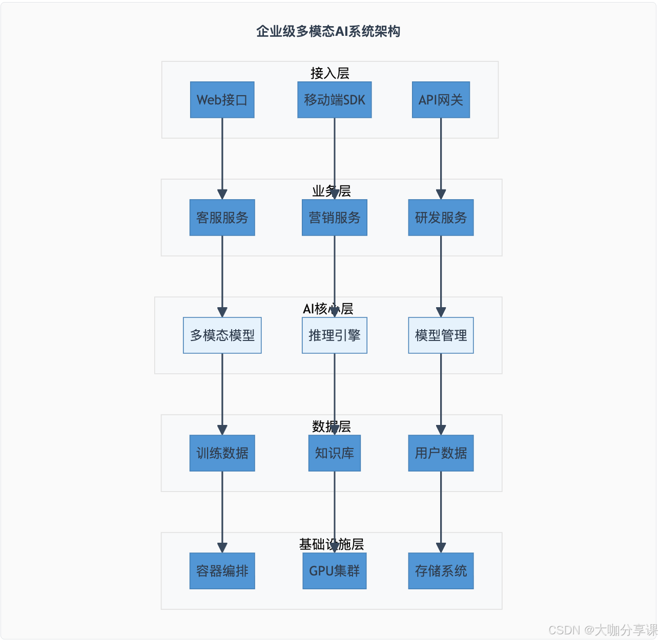 多模态AI系统的核心在于其独特的架构设计,它能够将不同模态的信息进行有效融合和理解。让我们通过以下架构图来深入了解: