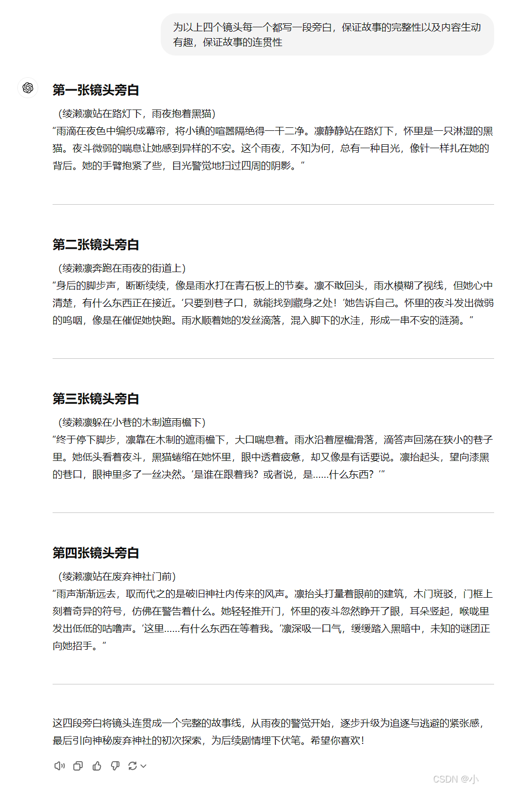 ,进一步完善故事视觉叙事,并为每张图片创作生动的旁白