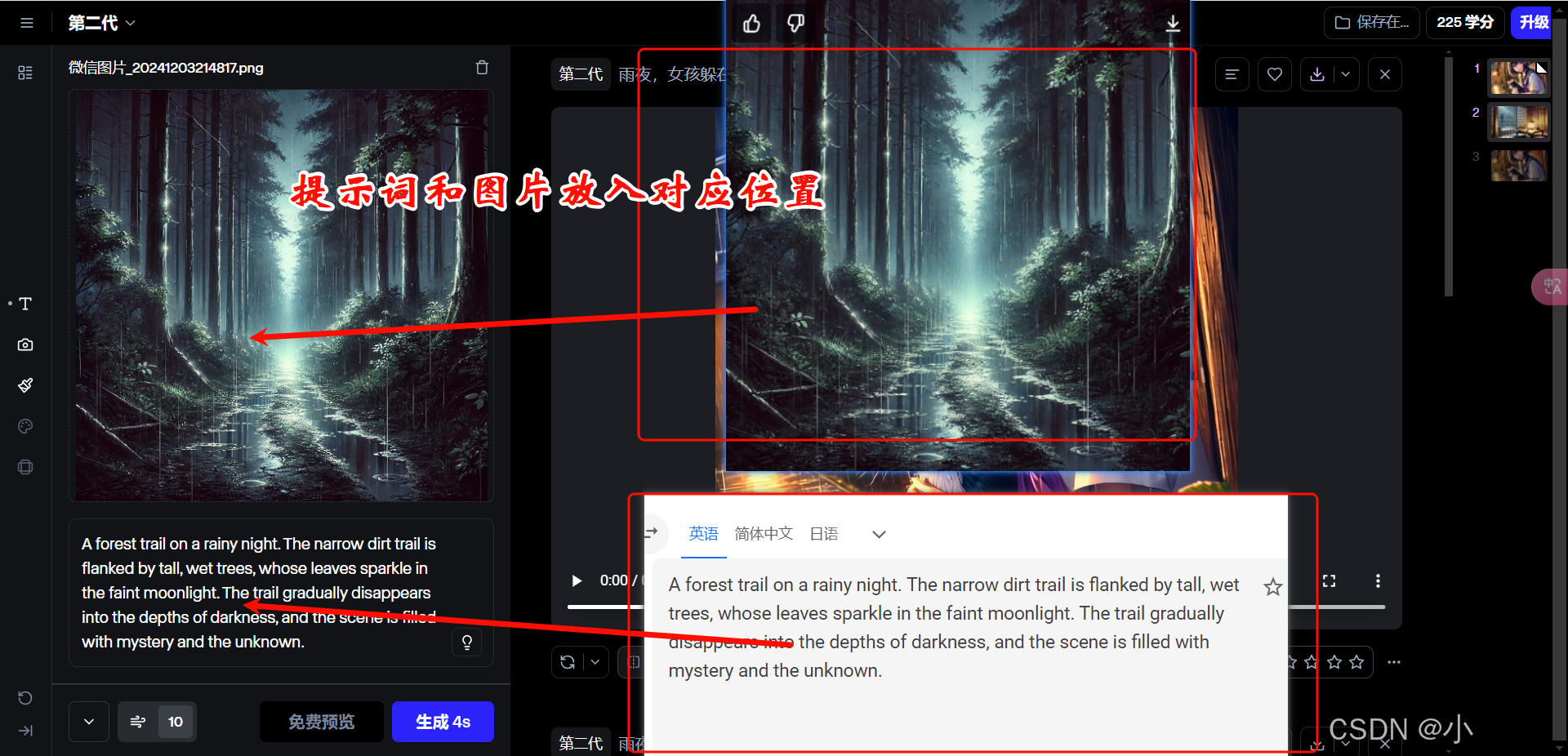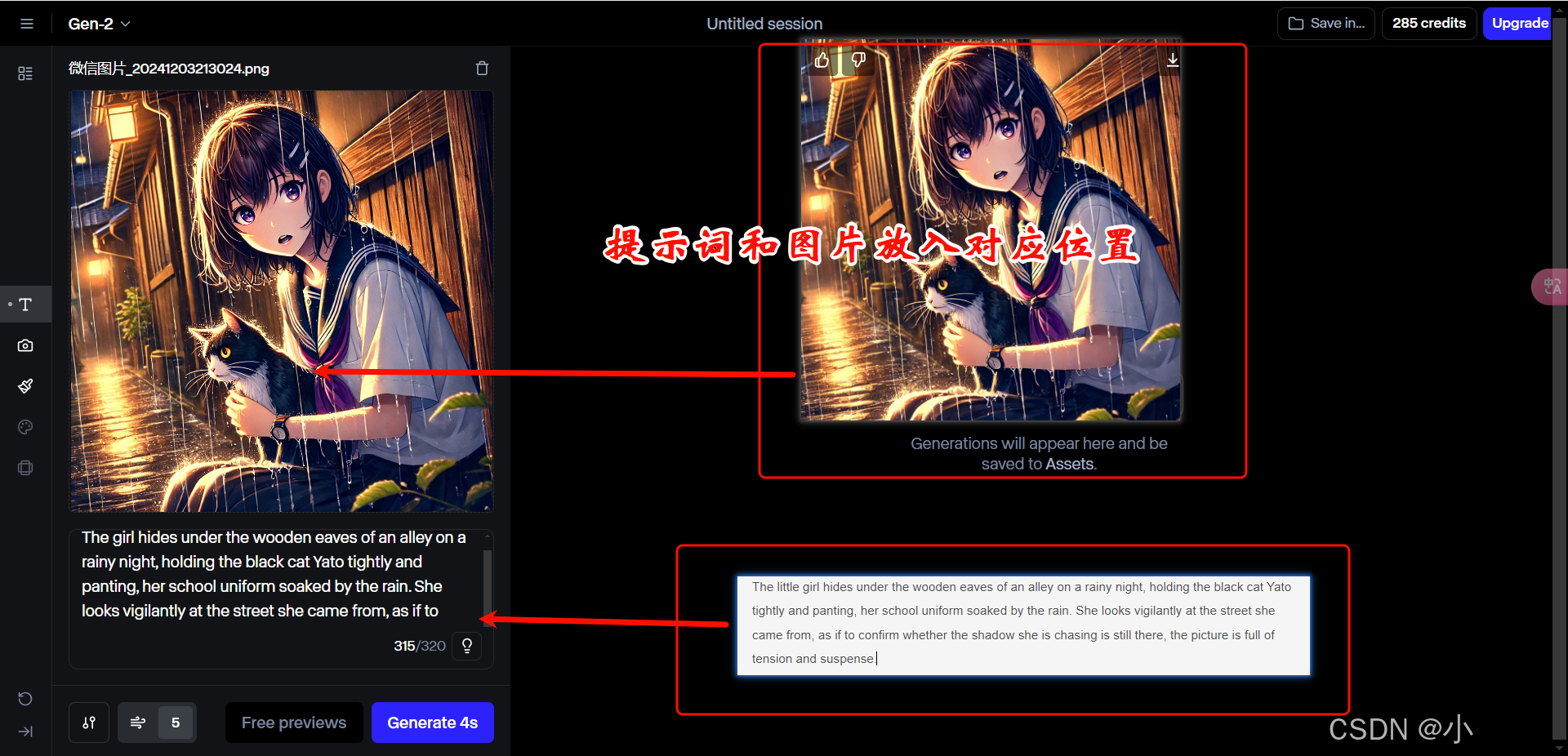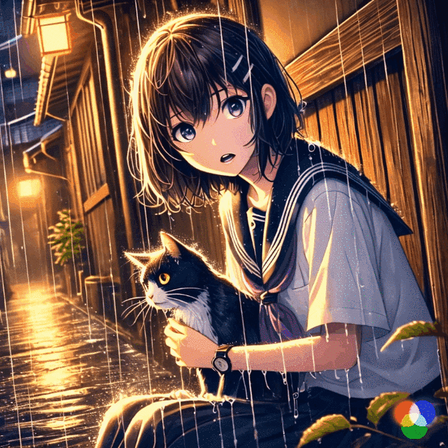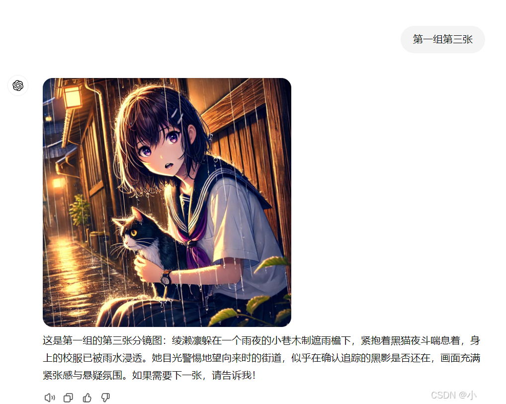 ,生成的英文文本作为我们生成视频的提示词。The little girl hides under the wooden eaves of an alley on a rainy night, holding the black cat Yato tightly and panting, her school uniform soaked by the rain. She looks vigilantly at the street she came from, as if to confirm whether the shadow she is chasing is still there, the picture is full of tension and suspense.