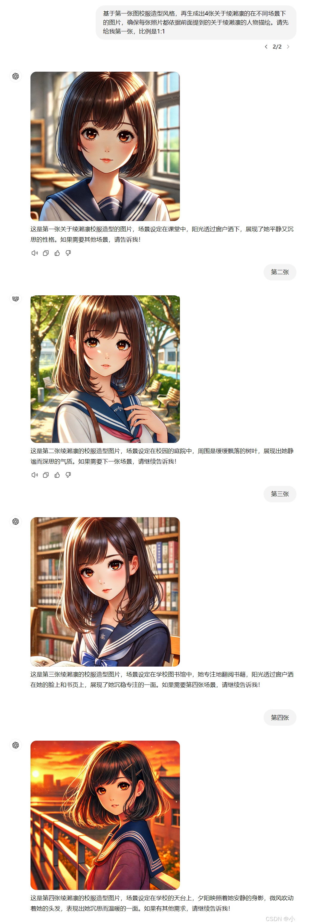 生成符合故事情节和角色形象的精美图片。在明确角色设定后,可以通过AI创作出多张不同服装设计的角色形象图片,以丰富人物的视觉表现力。在此基础上,还可以生成与特定场景