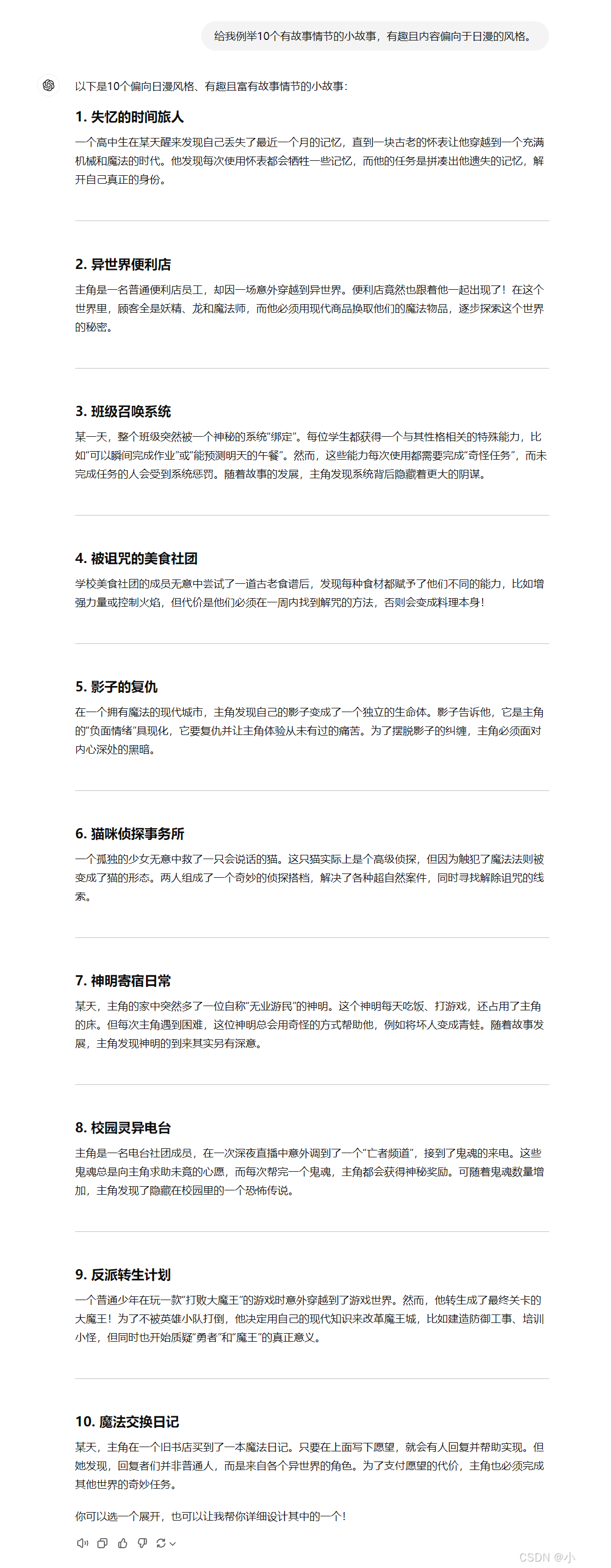 ,我们可以快速生成多个不同的故事情节:给我例举10个有故事情节的小故事,有趣且内容偏向于日漫的风格