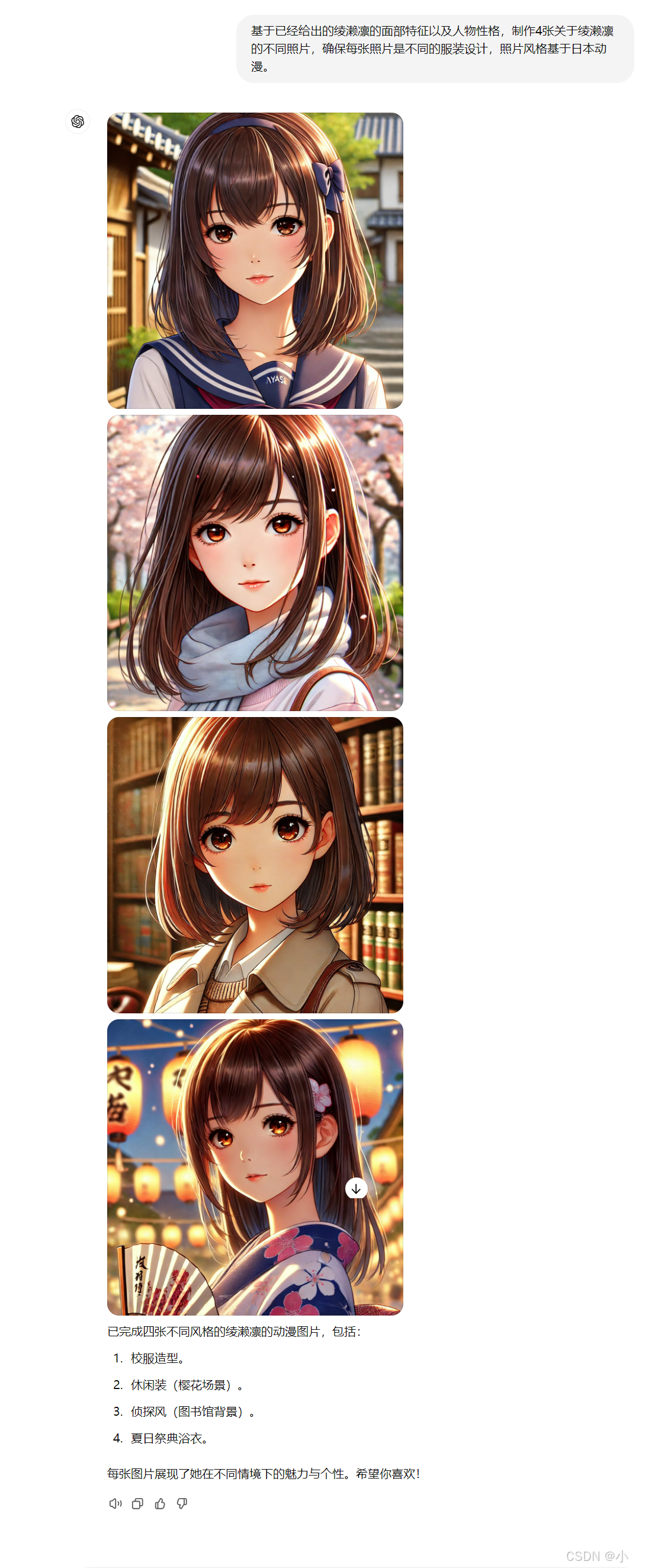 生成符合角色形象的图片:基于已经给出的绫濑凛的面部特征以及人物性格,制作4张关于绫濑凛的不同照片,确保每张照片是不同的服装设计,照片风格基于日本动漫。