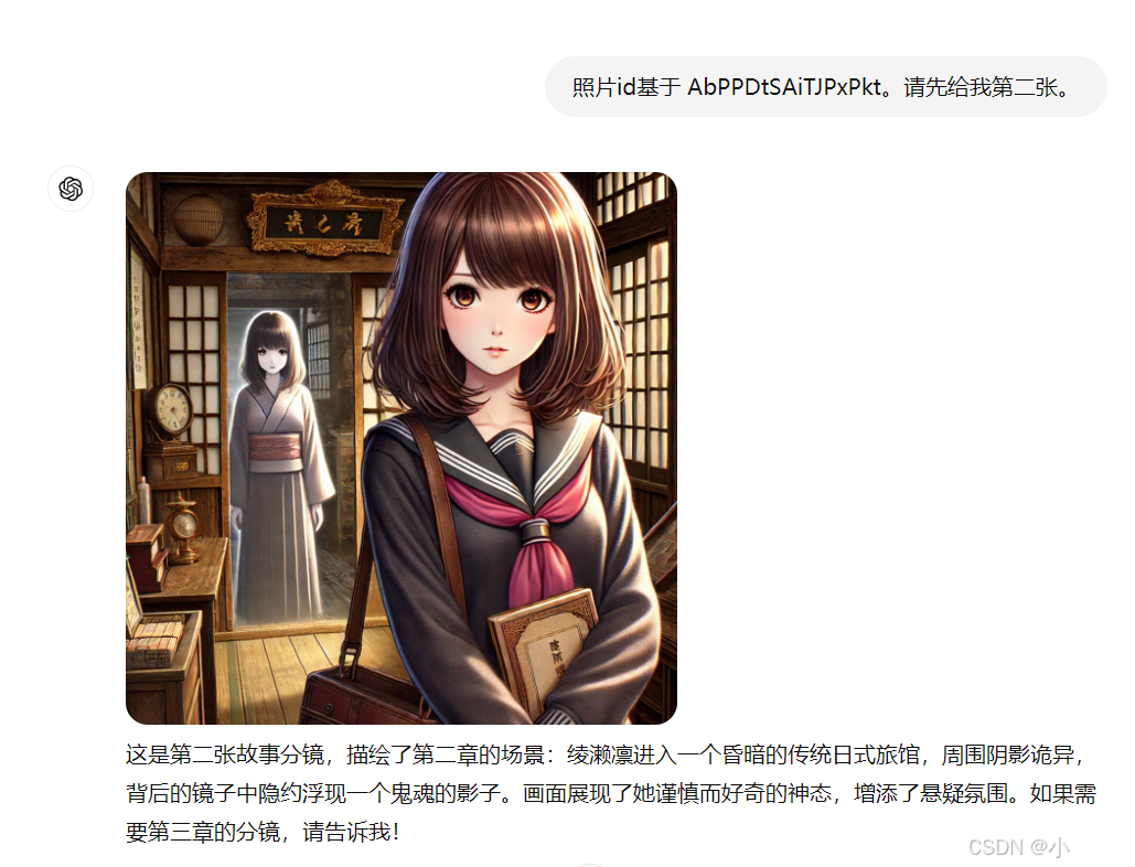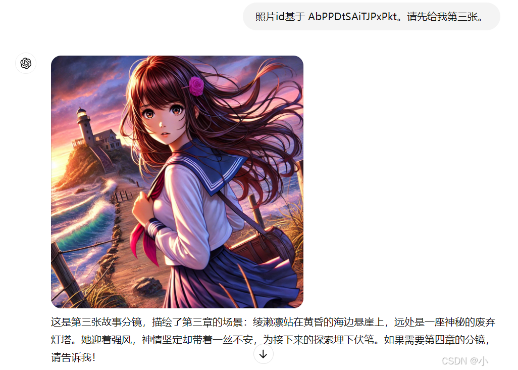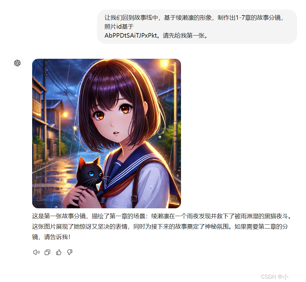 让我们回到故事线中,基于绫濑凛的形象,制作出1-7章的故事分镜,照片id基于 AbPPDtSAiTJPxPkt。请先给我第一张。