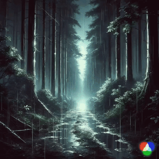 A forest trail on a rainy night. The narrow dirt trail is flanked by tall, wet trees, whose leaves sparkle in the faint moonlight. The trail gradually disappears into the depths of darkness, and the scene is filled with mystery and the unknown.