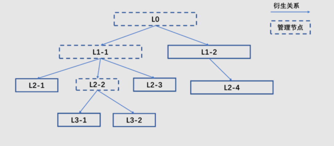 批次组织和衍生关系如图所示。随着衍生层次的加深,整个批次树的形态也逐渐发生变化。从订单的L0层衍生到执行批次的L1层,订单失去了具体的执行任务内容,变成了一个纯粹的管理组织节点。同样的情况也发生在L1-1的衍生过程中。