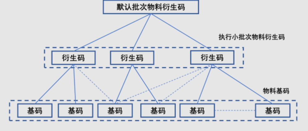 物料基码和衍生码之间的组织关系如下图所示。默认批次物料衍生码管理着执行小批次物料衍生码以及执行批次下的所有物料基码。而执行小批次物料衍生码则管理着执行小批次下的物料组合,并随着执行小批次的创建和消亡而不断变化。