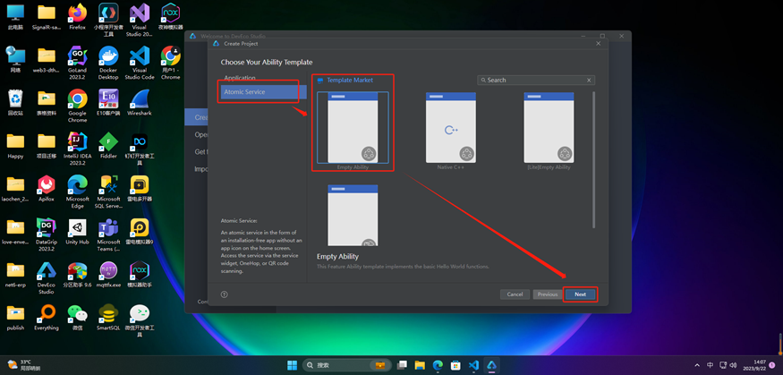 2、选择“Atomic Service”,选择“Empty Ability”模板,点击“Next”。