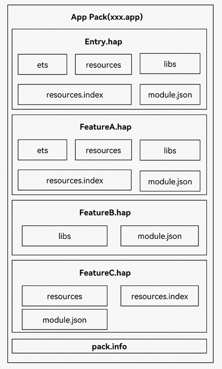 一个应用包含一个或者多个Module,以下是Module与UIAbility组件关系示意图: