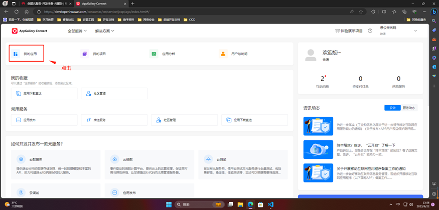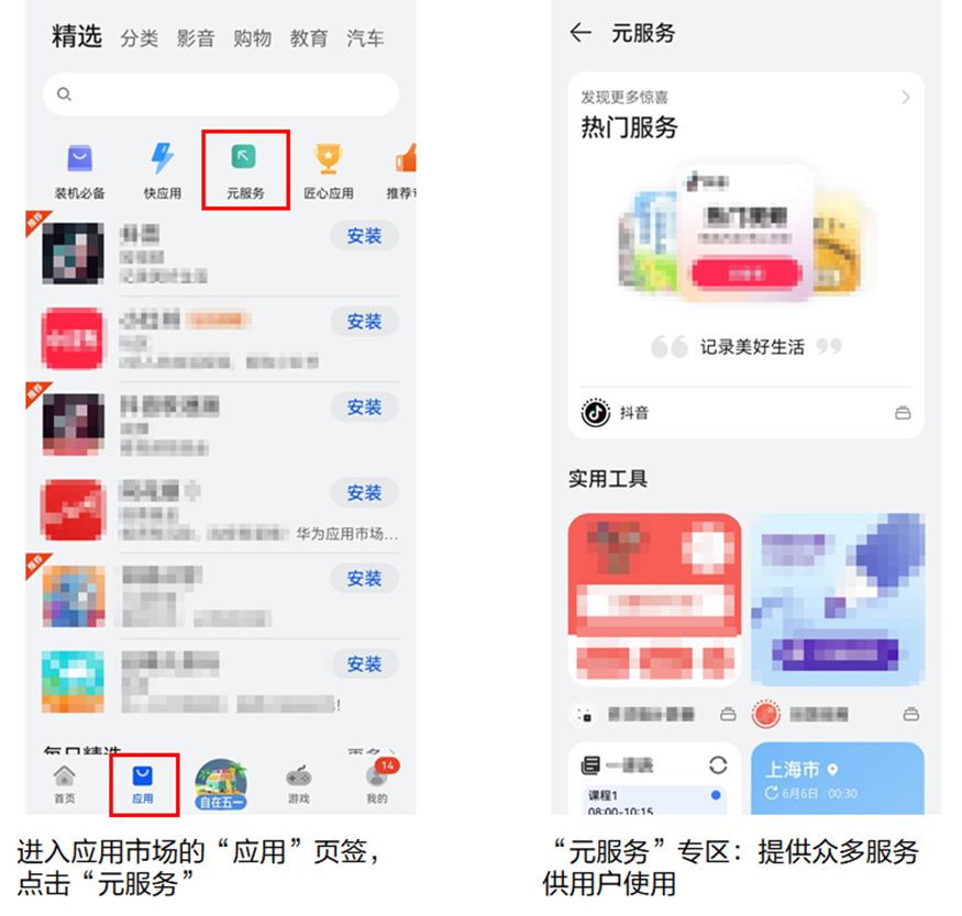 打开华为应用市场,点击“应用”页签,进入“元服务”专区发现并使用元服务。