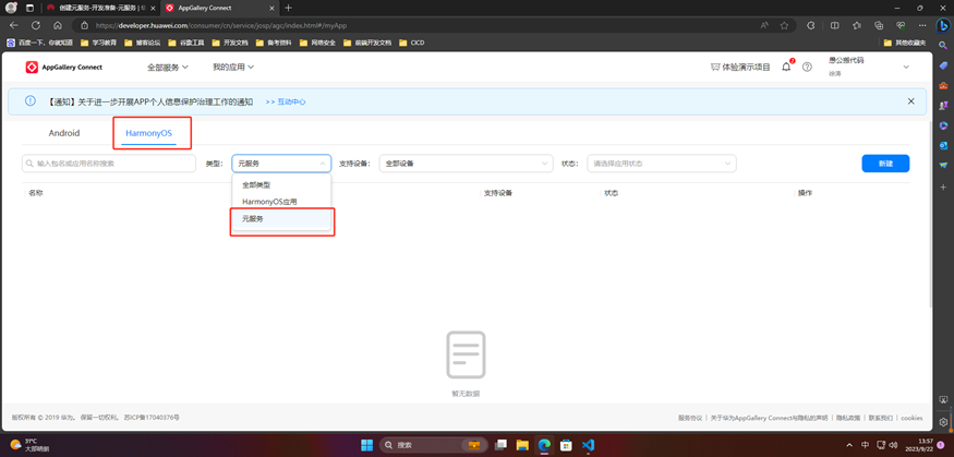 2、在“HarmonyOS”页签,“类型”选择“元服务”,可以查看创建的元服务。