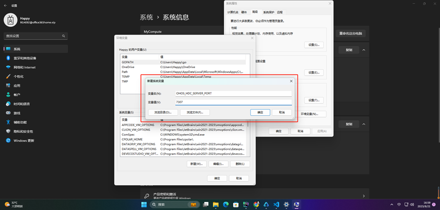 2、在“系统变量”中添加 HDC_SERVER_PORT和OHOS_HDC_SERVER_PORT 两个变量,变量值设置为未被占用的端口,例如7036和7037