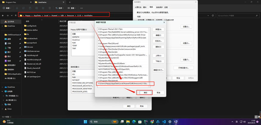 3、在用户或者系统的path变量中,添加HDC工具的路径。 HDC工具路径为:HarmonyOS SDK安装目录/hmscore/{版本号}/toolchains。例如:C:\Users\XXXXX\AppData\Local\Huawei\Sdk\hmscore\3.1.0\toolchains