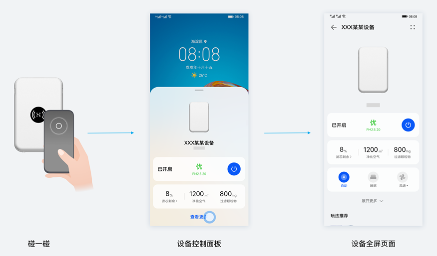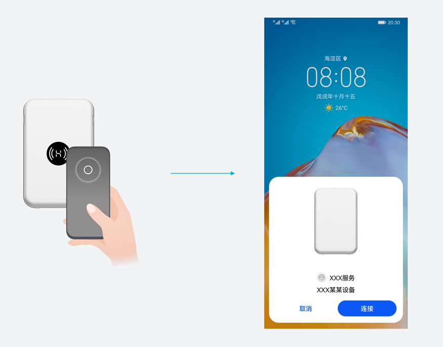 用户首次“碰一碰”或者“扫一扫”识别设备上的NFC标签,系统引导用户连接设备,连接成功后,再次“碰一碰”或者“扫一扫”即可直接使用相应的元服务。