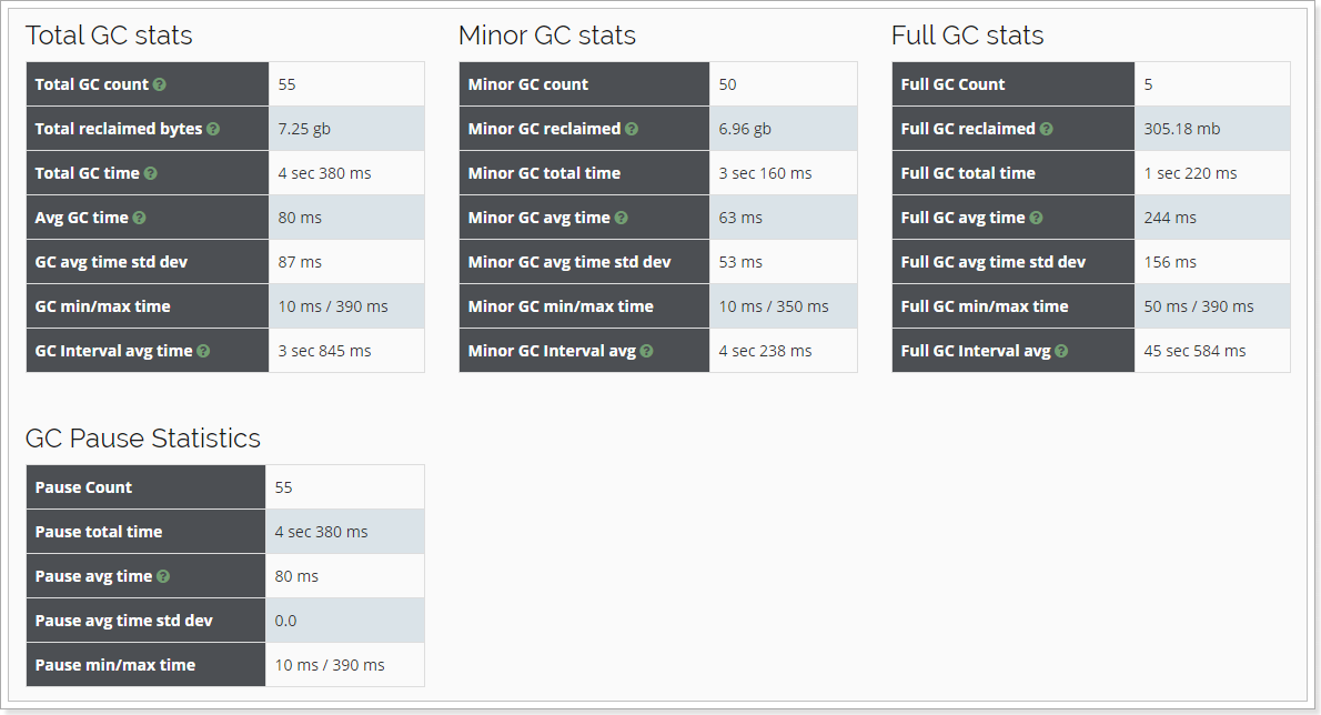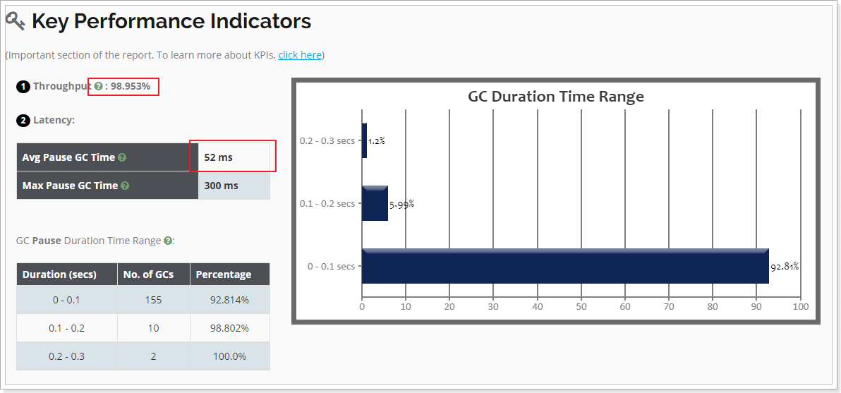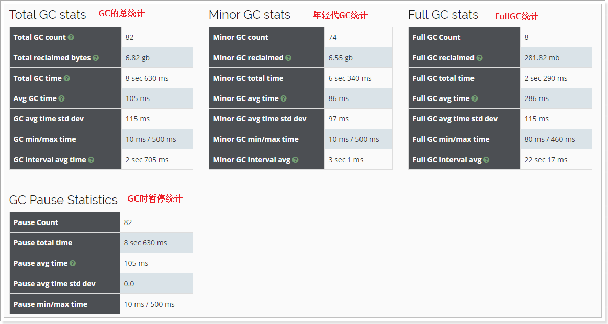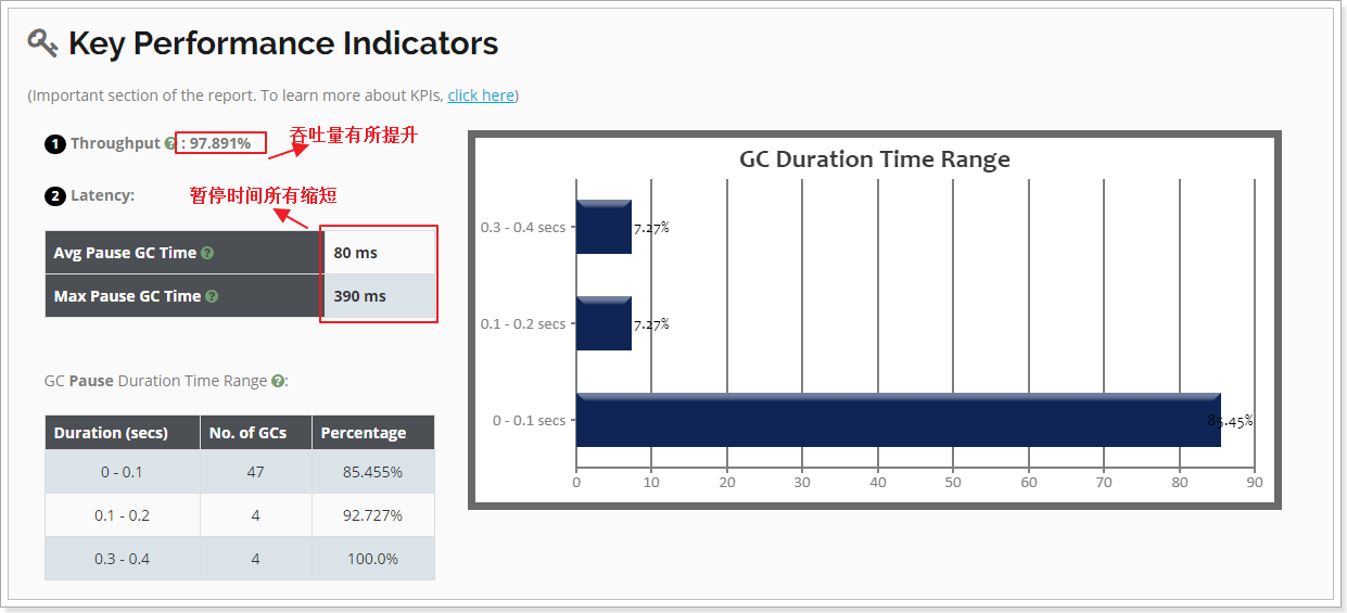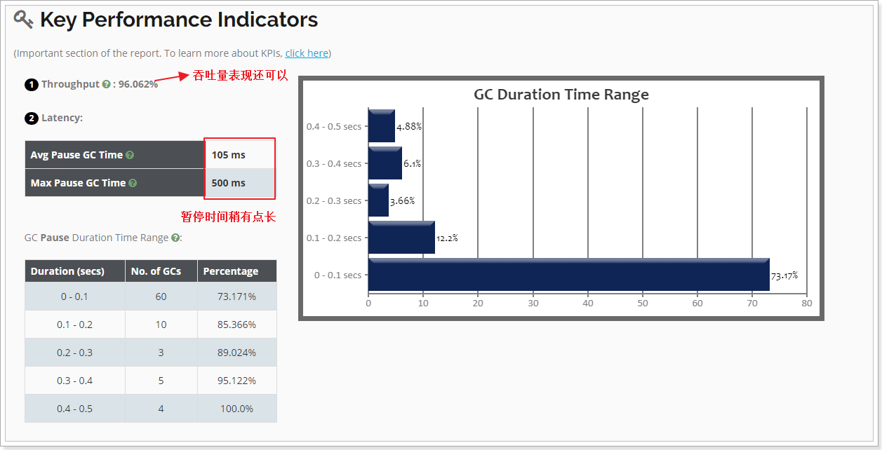可以关键指标中可以看出,吞吐量表现不错,但是gc时,线程的暂停时间稍有点长。