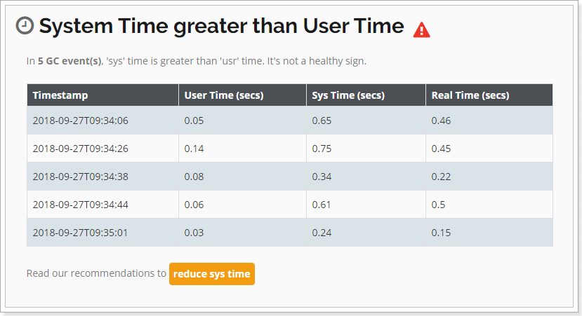 在报告中显示,在5次GC时,系统所消耗的时间大于用户时间,这反应出的服务器的性能存在瓶颈,调度CPU等资源所消耗的时间要长一些。