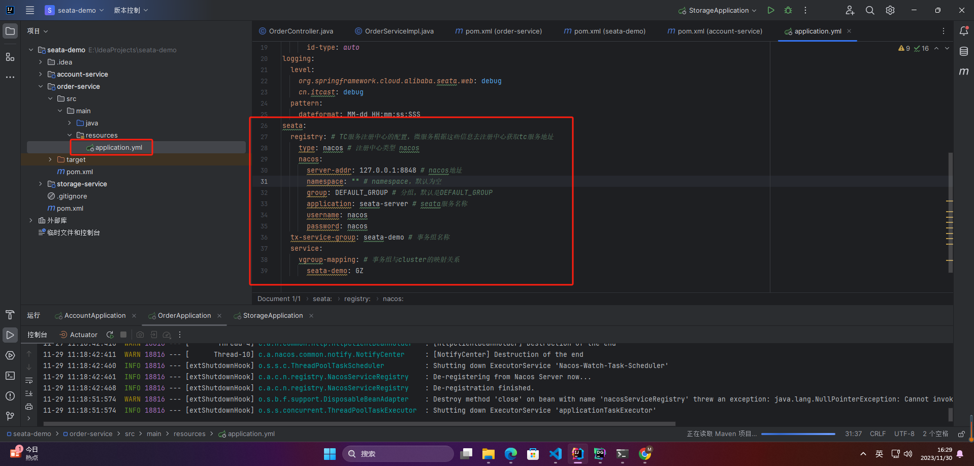 在order-service中的application.yml中,配置TC服务信息,通过注册中心nacos,结合服务名称获取TC地址: