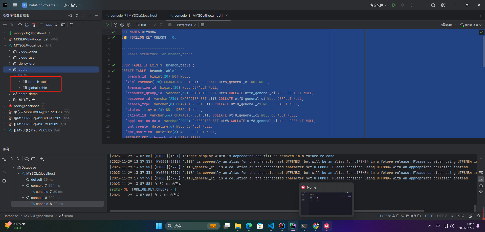 特别注意:tc服务在管理分布式事务时,需要记录事务相关数据到数据库中,你需要提前创建好这些表。