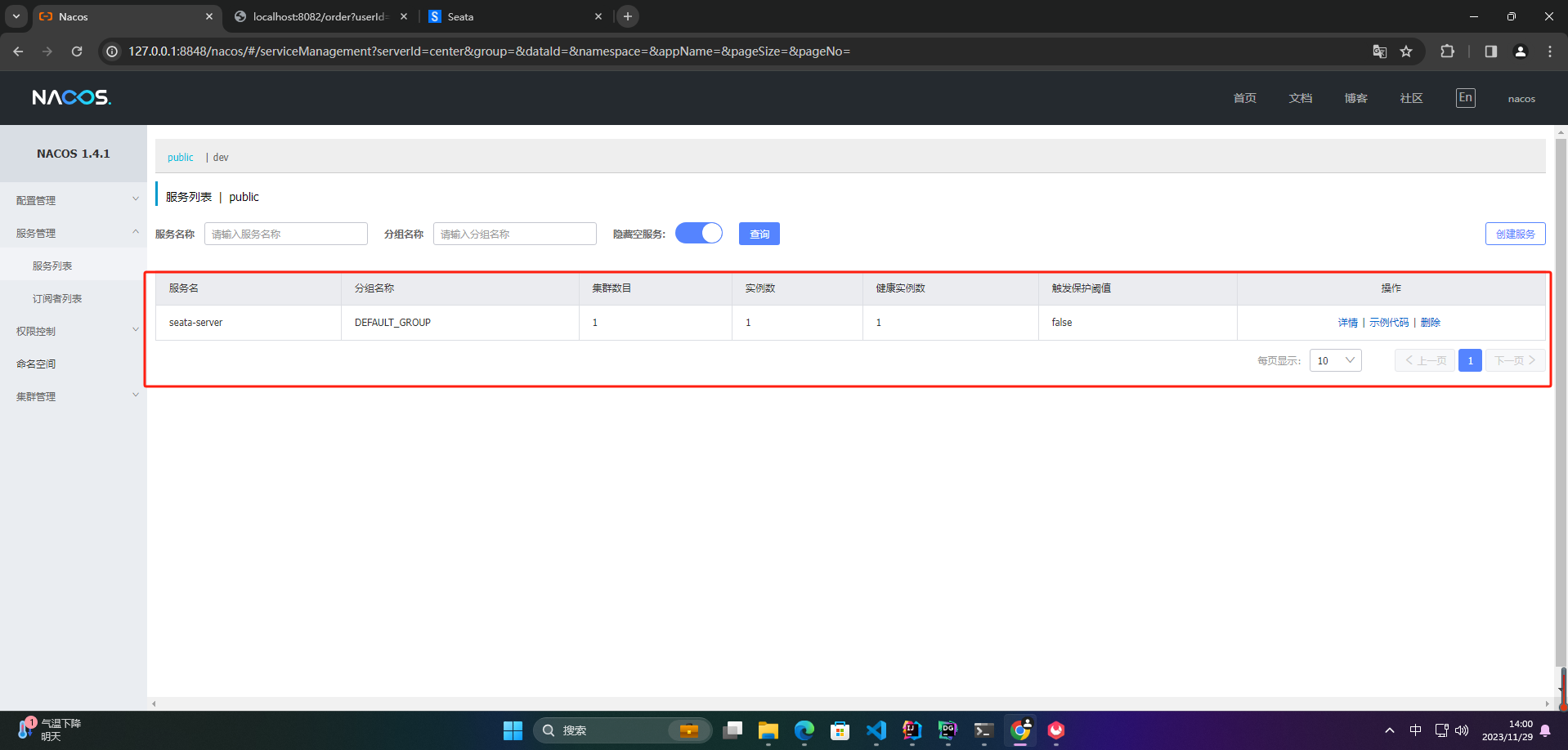 打开浏览器,访问nacos地址:http://localhost:8848/nacos,然后进入服务列表页面,可以看到seata-server的信息: