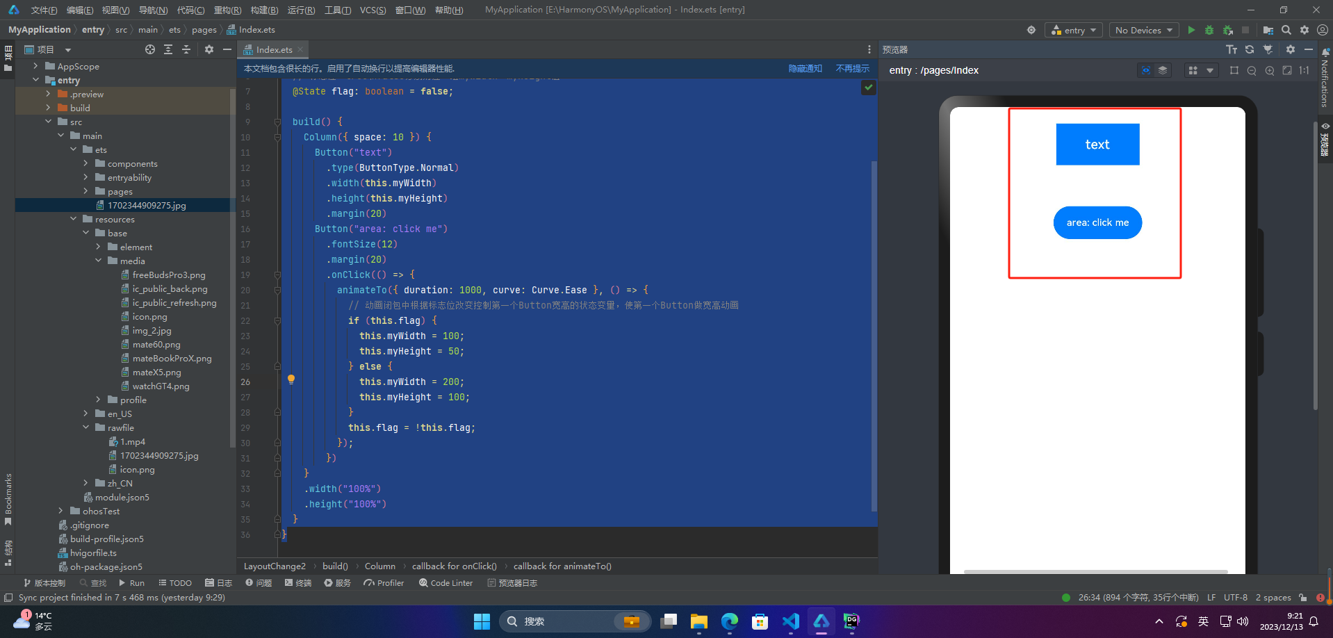 // 动画闭包中根据标志位改变控制第一个Button宽高的状态变量,使第一个Button做宽高动画