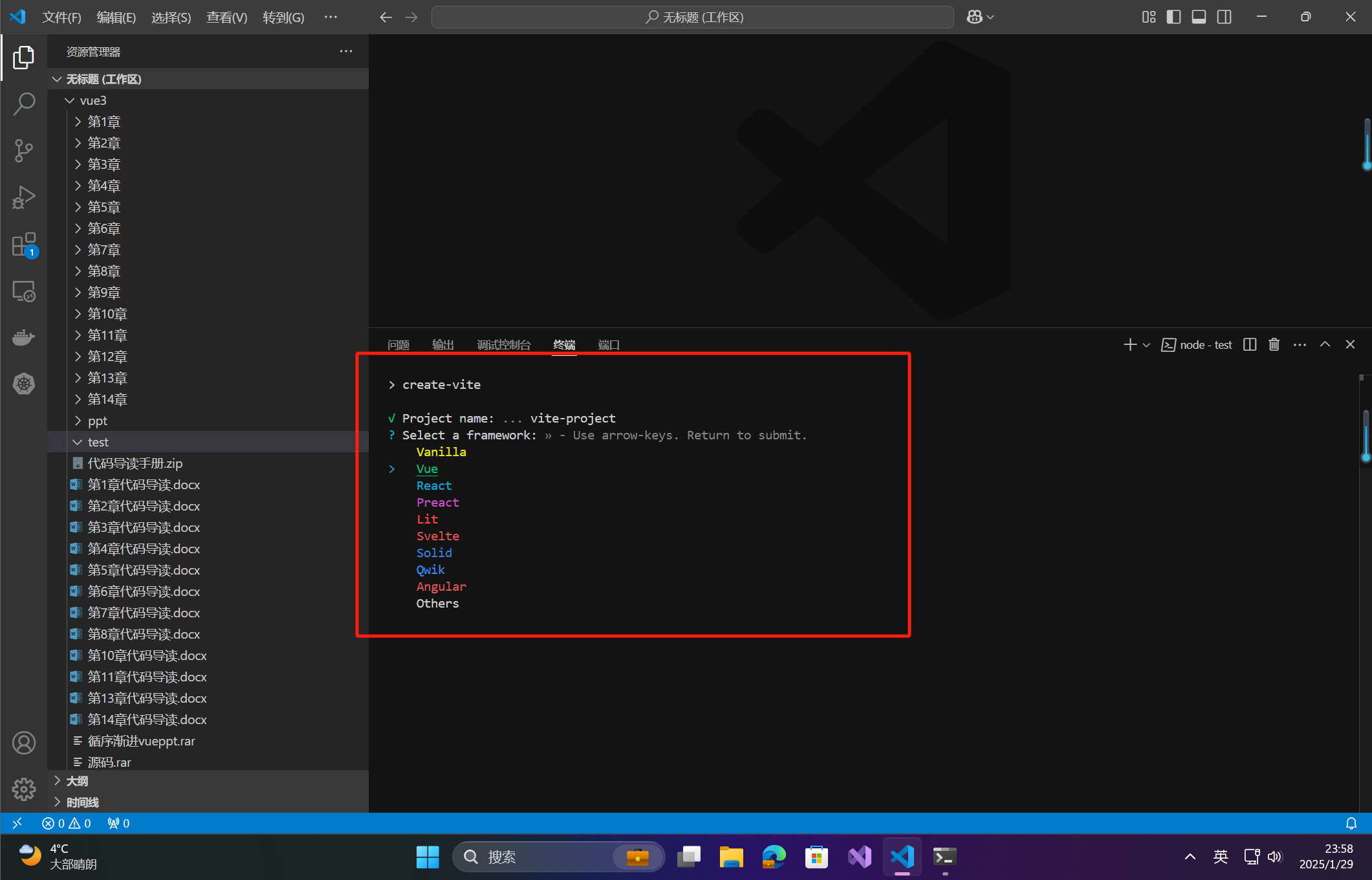 你可以选择 Vue、React 或 Vanilla,然后 Vite 会自动为你创建相应的项目。