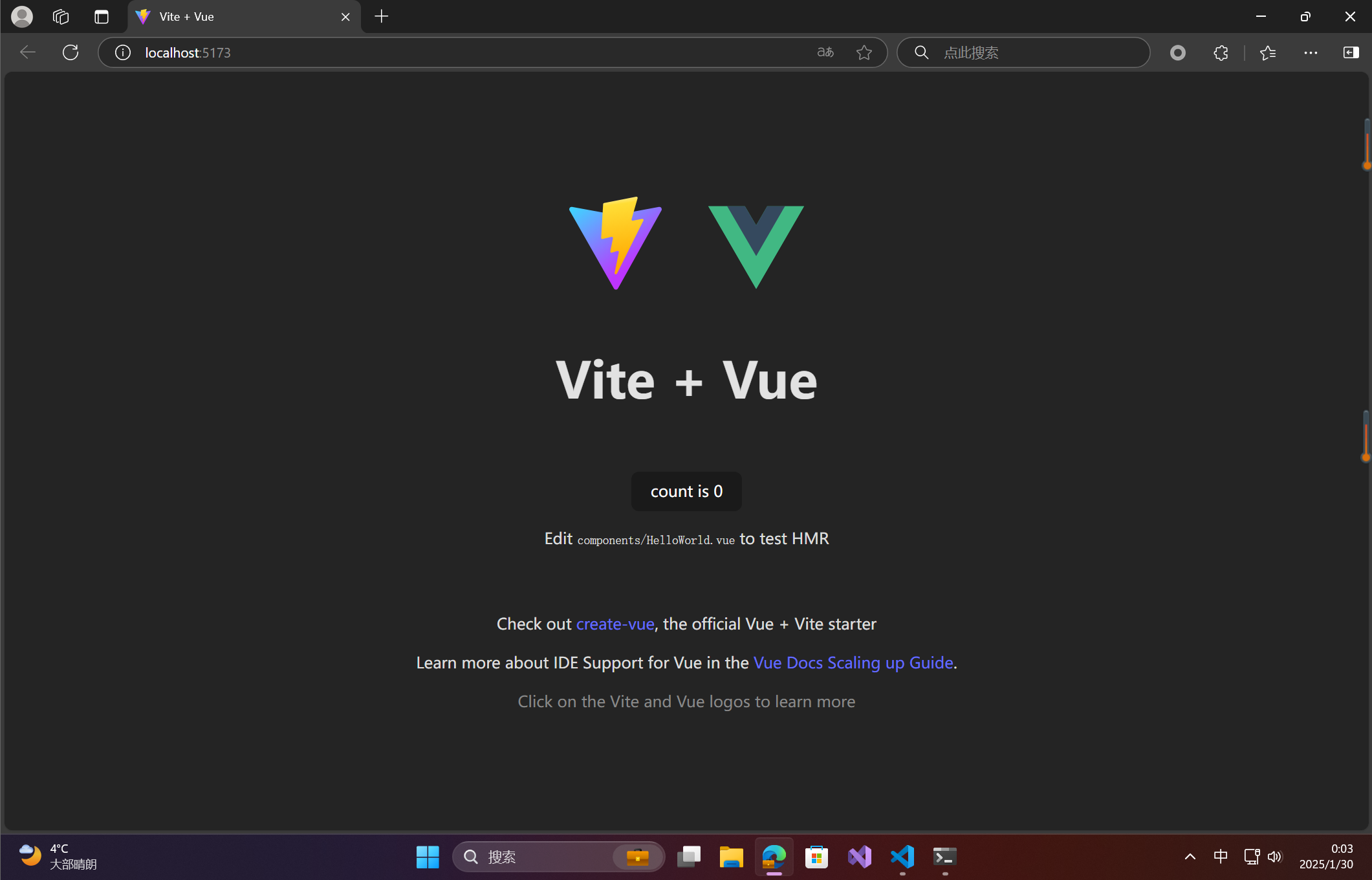 默认情况下,开发服务器会启动在 http://localhost:5173。你可以在浏览器中访问这个地址,看到你创建的项目。