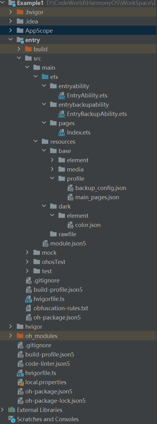 如上图所示,该项目整体结构为HarmonyOS示例空Ability项目结构。一个常规的鸿蒙应用项目,重点需要关心编码的部分,分为三个: