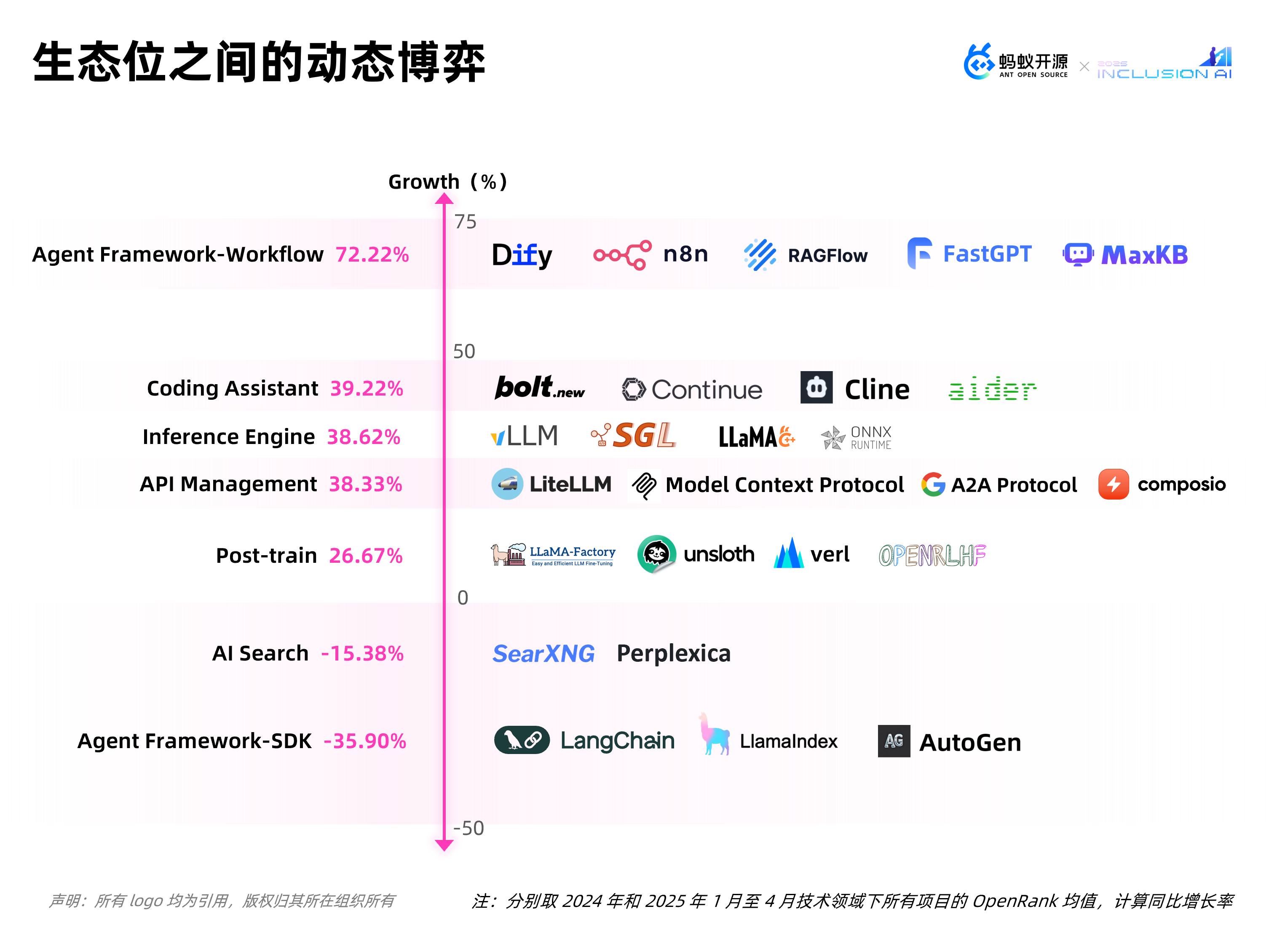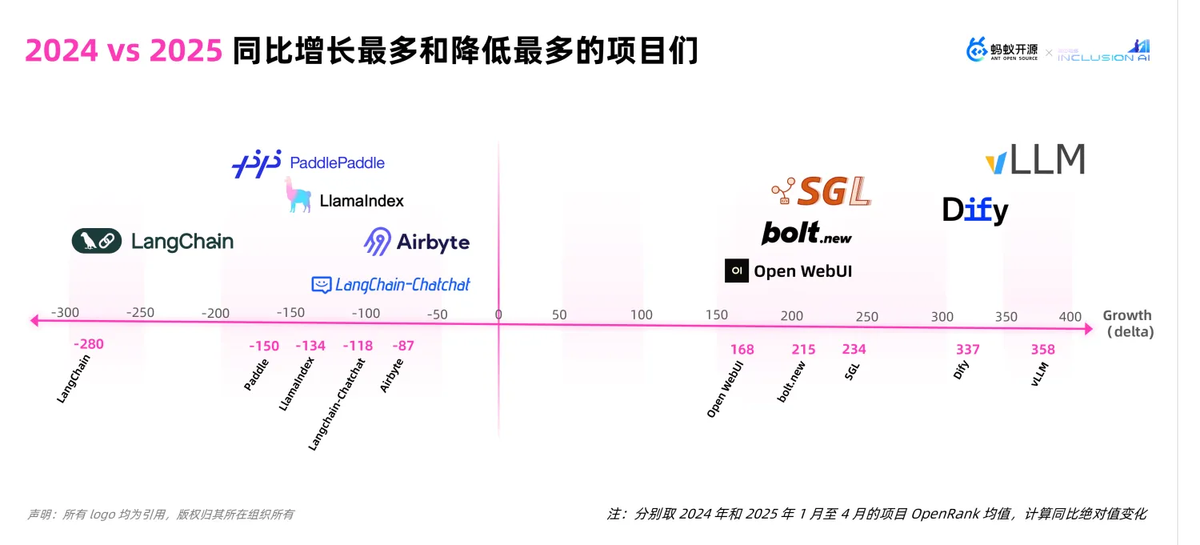 结合这些项目的排名分布,再对比 2024 和 2025 年 OpenRank 的同比绝对值变化,可以看到三大主导的技术领域:模型训练框架、高效推理引擎和低代码应用开发框架。