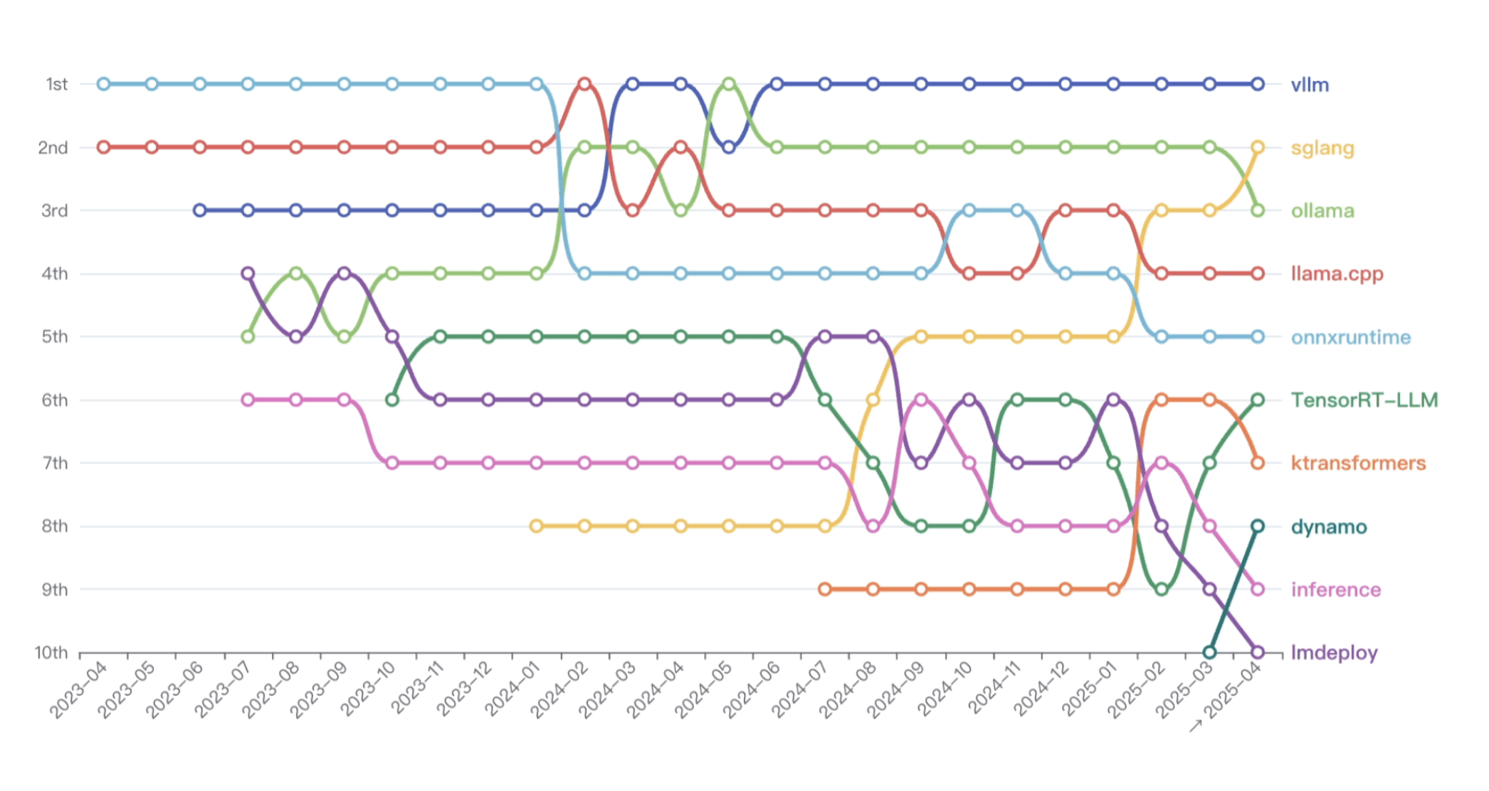随着大语言模型的大规模部署,模型推理效率、资源利用率和部署灵活性成为影响应用落地的关键因素。2023 年以来,出现了一大波面向于模型部署和高效推理的大模型服务工具,在性能和生态上彼此追赶,混战一直持续到今天。从 Top 10 的模型服务项目的排名变化上来看,仍有新的项目不断冒出来,并吸引开发者参与到其中去。例如去年 7 月清华推出的 KTransformers 和今年 3 月 NVIDIA 推出的 Dynamo。