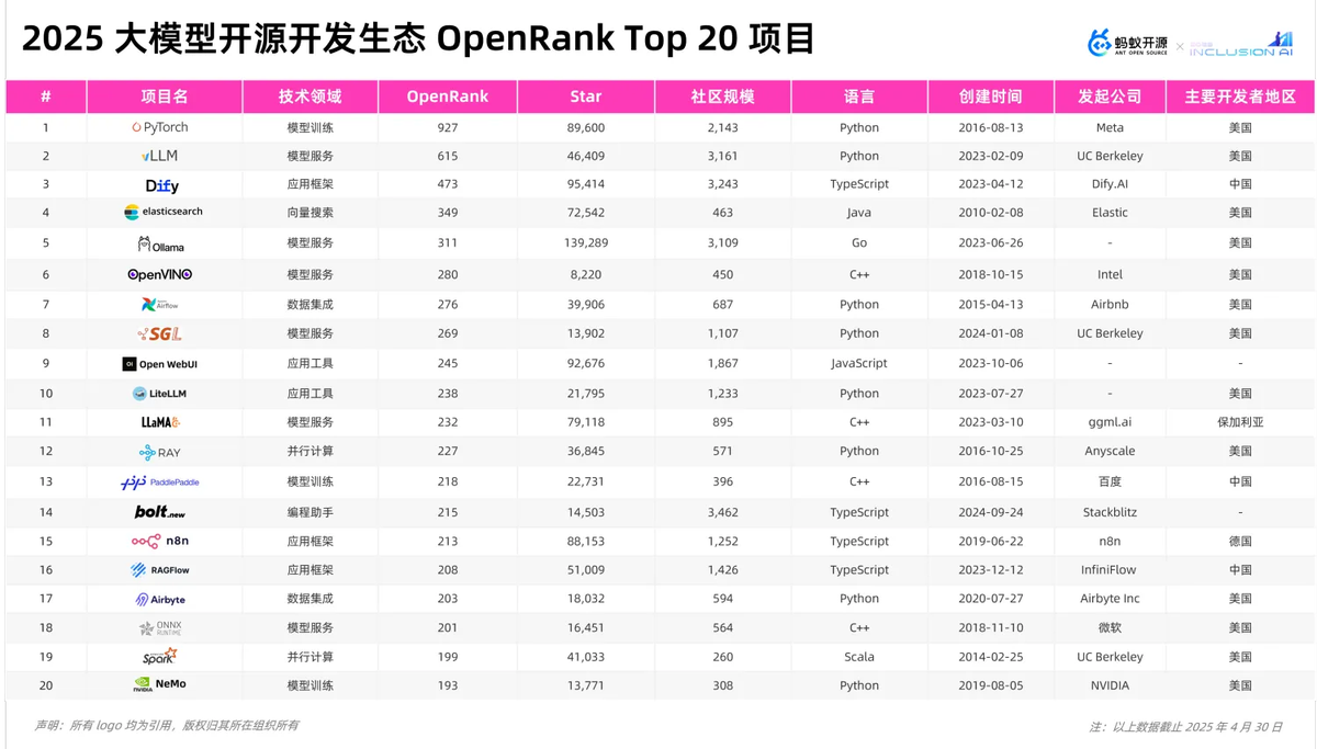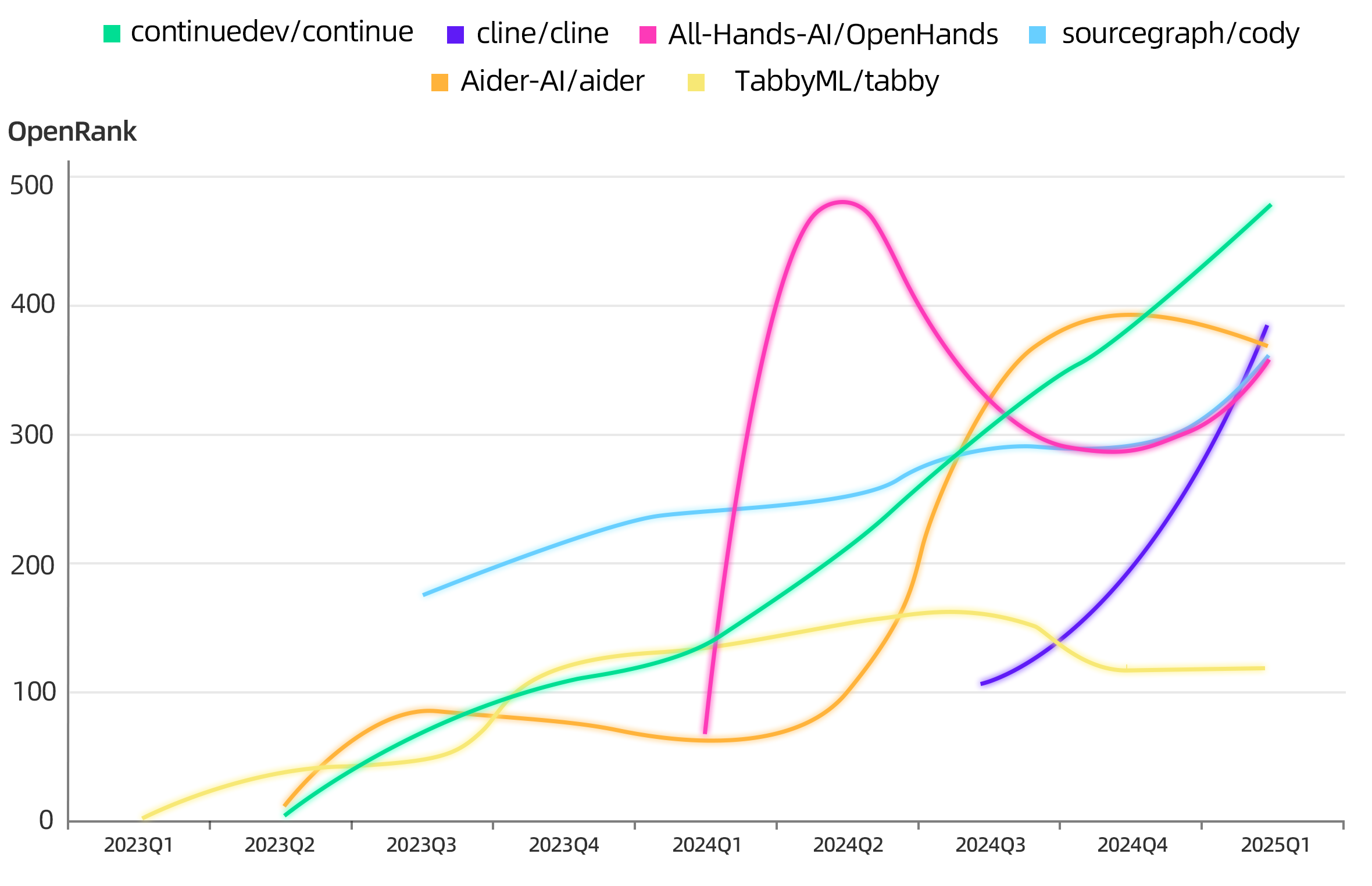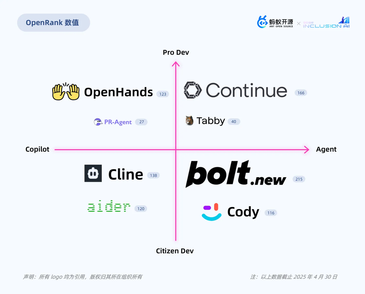 AI Coding 开源项目的火热:与之相对的,模型能力的提升正在引发软件开发范式的变革。Claude 3.7 Sonnet 在编码和 Web 开发方面的突出表现让 AI 辅助编程进入了一个新阶段。开发者通过自然语言描述场景,模型自主完成需求分析和代码实现的 “氛围编程”(Vibe Coding)开发范式已经悄然形成。现阶段,除了商业化产品 Cursor、Windsurf 等验证了市场热情外,以 Continue、Cline 为代表的 IDE 插件形态的项目们也是主流的开源选择,这两个项目的社区参与者人数都已经超过 3000 人,且 OpenRank 曲线持续攀升。顺便提一下,蚂蚁也在 2023 年开源了 AI Coding 平台 CodeFuse,从软件开发的全生命周期辅助开发者进行 AI 原生的软件开发,虽然本次没出现在全景图上,但还是欢迎大家关注。