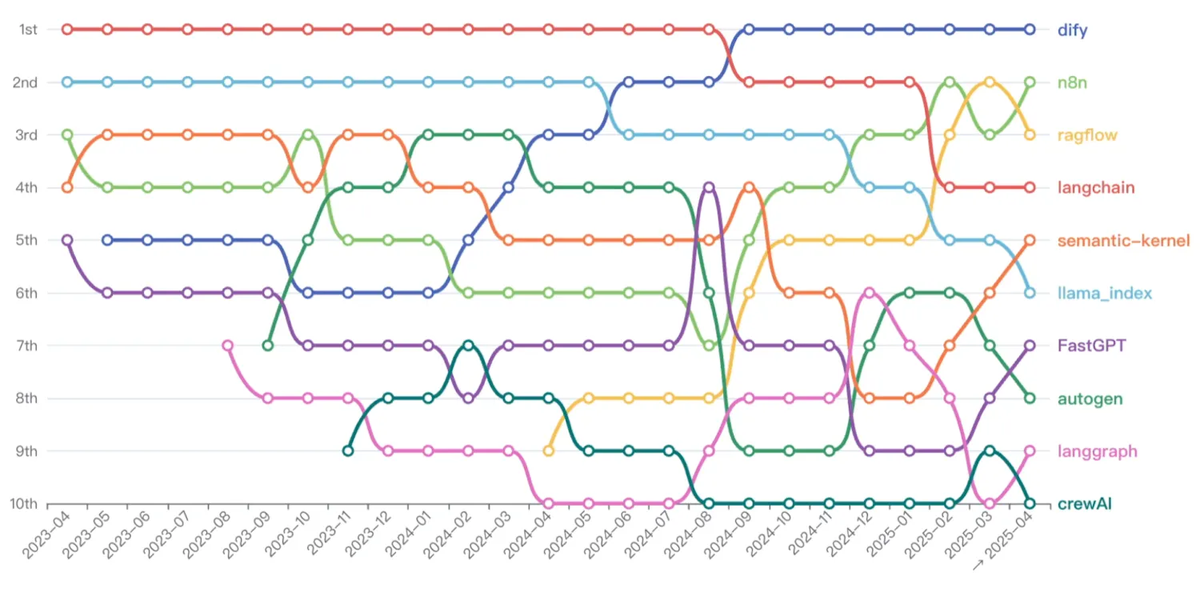 2023-2024 年间,以 LangChain 为代表的"全能型"框架凭借其开创性的任务编排能力和丰富的工具集成一度主导市场,在此期间也涌现出了一大批新的 Agent 开发框架,无论是主打工具调用、RAG 接入、长上下文记忆、ReAct 规划,无数的智能体开发框架在不同的技术概念和浪潮下迅速崛起;到 2024 年下半年,格局初步形成,已经少有看到新的开发框架出现,热潮褪去之后,我们看到早期主导市场的 LangChain 因为陡峭的学习曲线和复杂的调试成本在明显的走向下坡;进入 2025 年,格局呈现出分化的趋势:Dify、RAGFlow 等平台通过低代码工作流和企业级服务的落地开始主导市场;而以 LangChain 和 LlamaIndex 为代表的开发框架日渐式微。