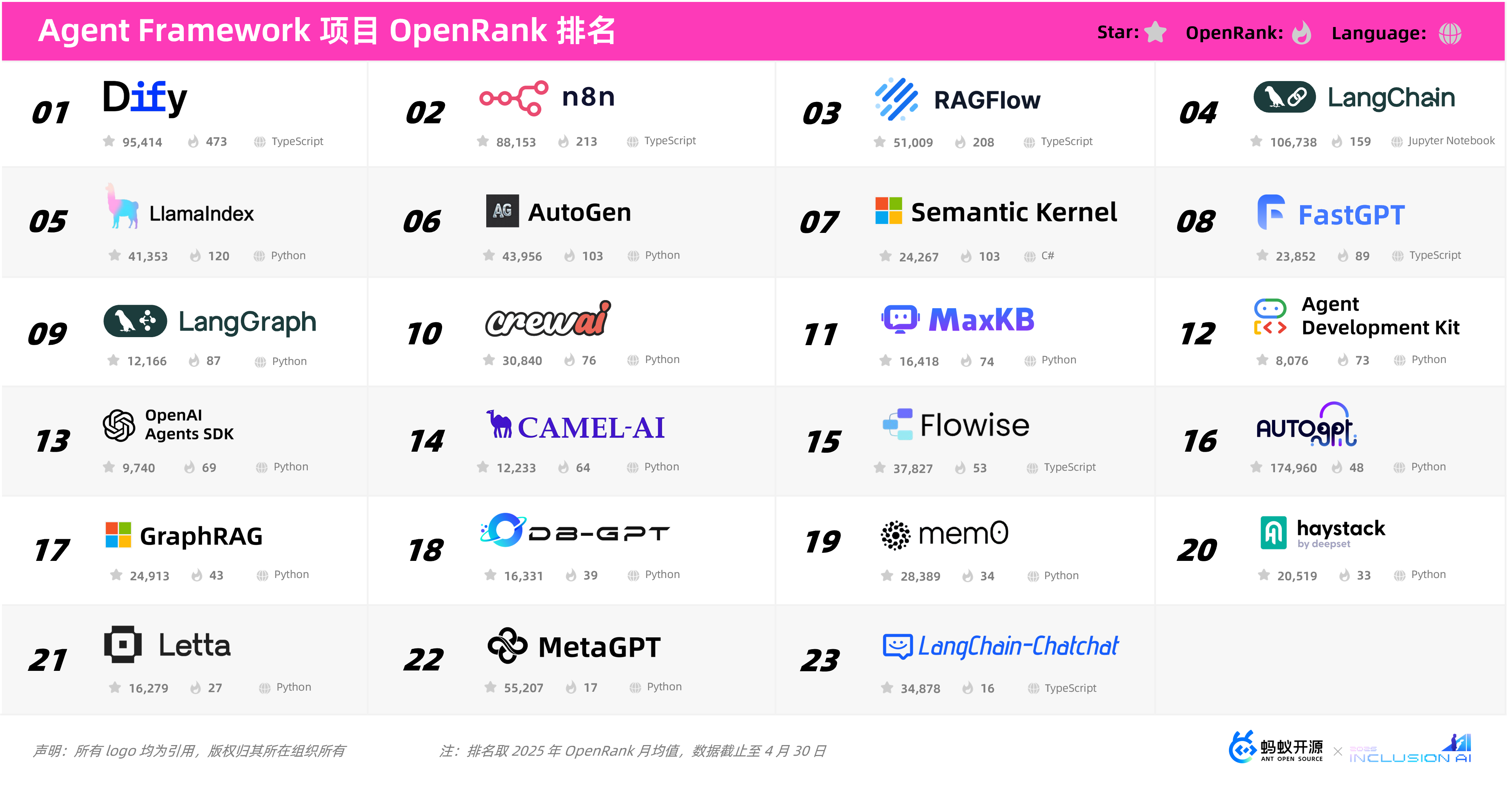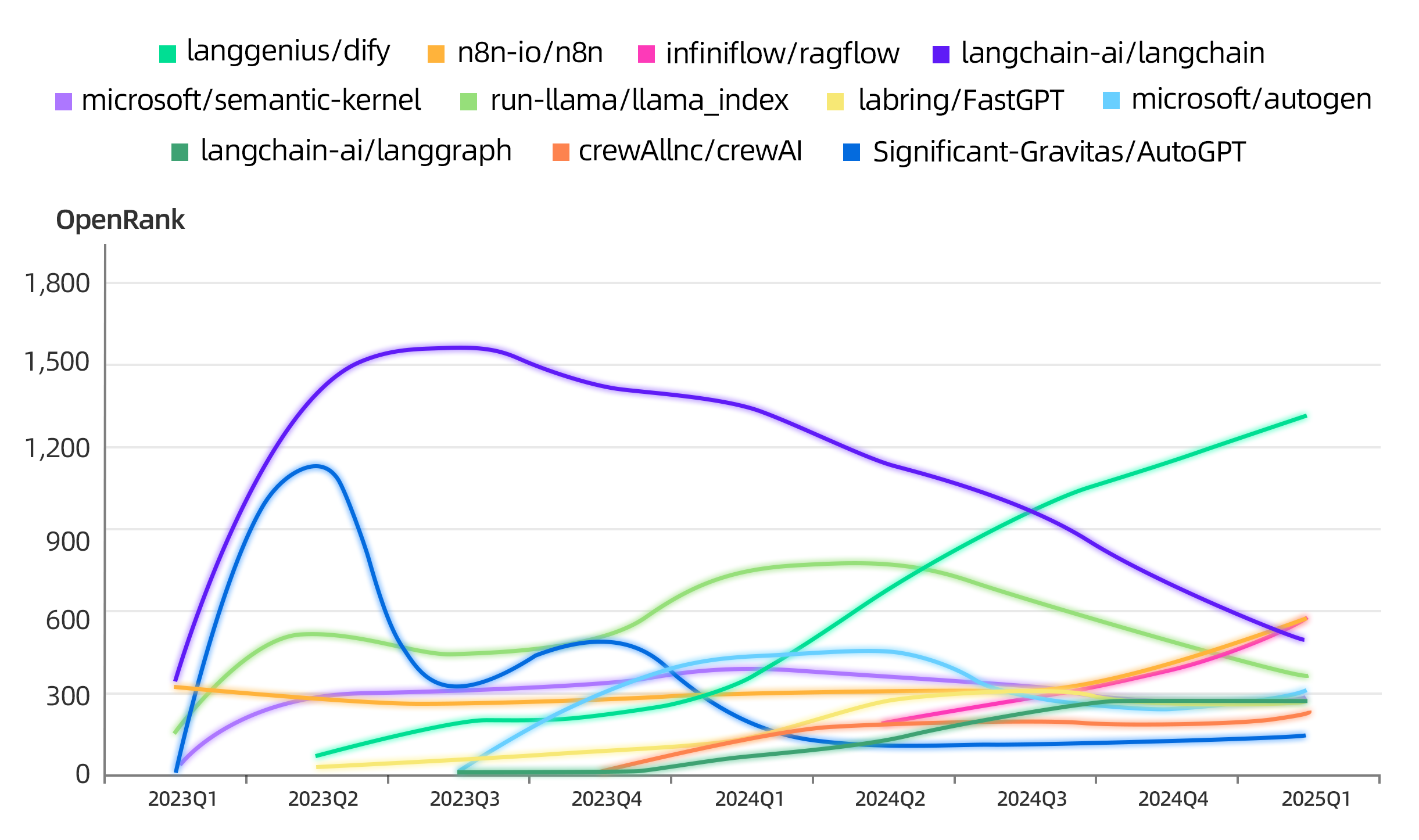 Agent 开发框架 OpenRank Top 10 排名变化